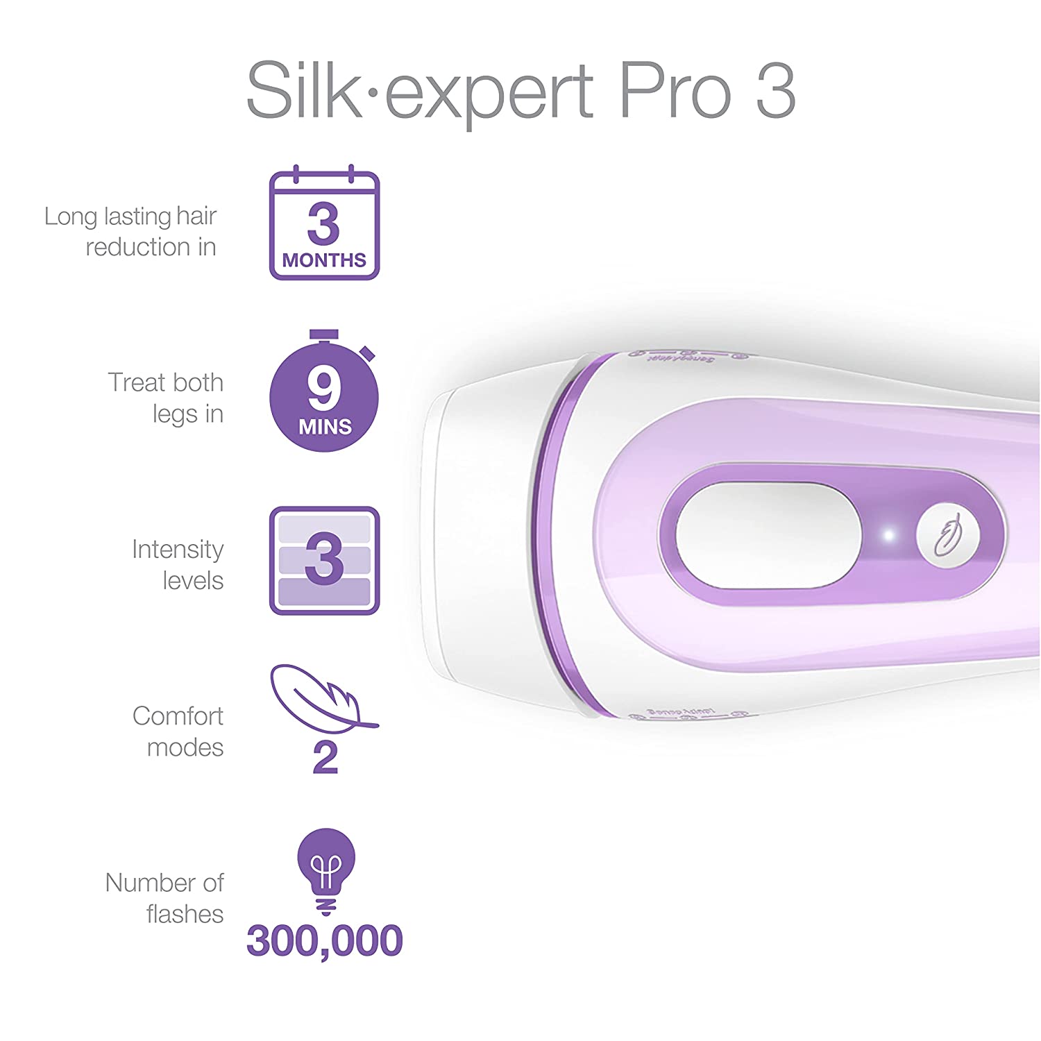 Silk·expert Pro, Braun’s latest generation IPL. Silk·expert Pro 3 ensures long-lasting hair reduction in just 3 months*. The safest IPL technology, clinically tested and dermatologically accredited as skin safe by a leading international skin health organization (Skin Health Alliance). The only IPL that automatically and continuously adapts to skin tone for a safe and effective visible long-lasting hair removal†. Now with a precision head to tackle smaller areas like the face, bikini line or underarms. Get results 2 times faster than with previous Silk·expert 3: just 9 minutes for both legs. 300,000 flashes, 20% more than previous Silk·expert 3. *Assessed on lower leg, armpits & bikini, following the treatment schedule. Individual results may vary. †Shared technology with Cyden. **For more information, visit Braun.com website