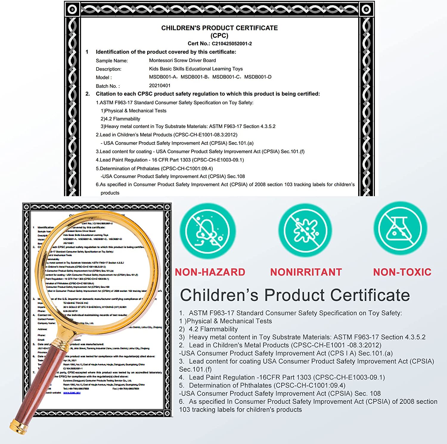 • This Montessori Materials Toys Set Lets Kids (3+) Practice of Using A Screwdriver, Hexagonal Head By Removing and Re-inserting Five Screws Using The Supplied Tools.