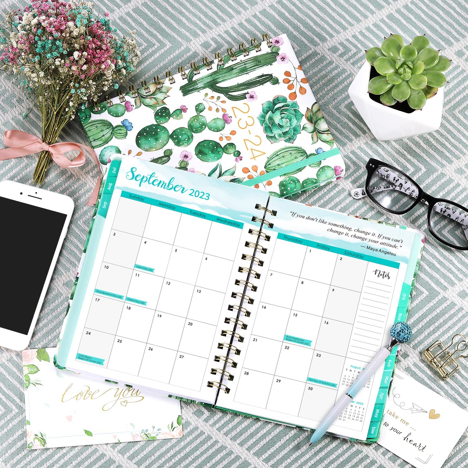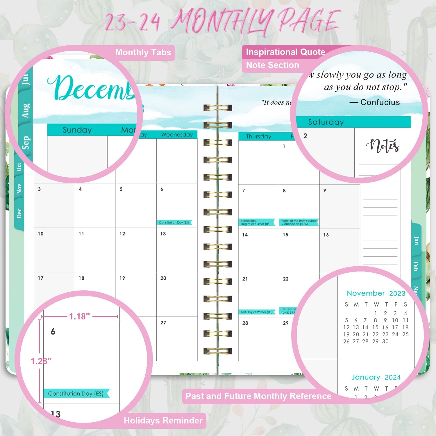 • ?PLAN YOUR MONTH - Monthly view pages of this planner 2023-2024 give a reference of the previous and next month calendars for a simple past reviewing and future planning. And the note section to write down your monthly ideas, thoughts and more. Moreover, there are inspirational quotes on every monthly pages to keep you motivated..