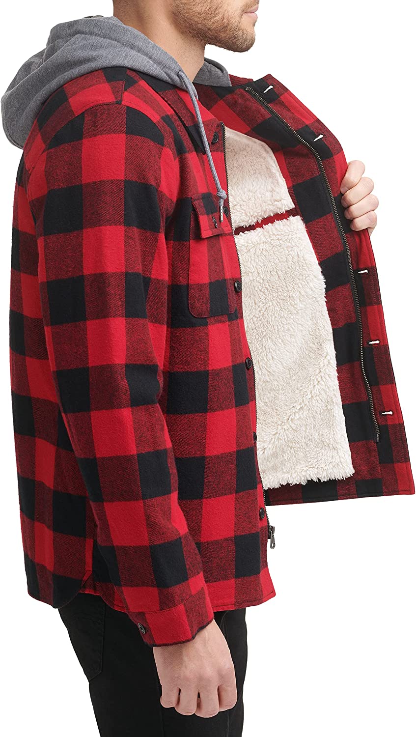 This classic shirt jacket provides you with comfort and style. The full Sherpa lining and jersey hood add extra warmth for chilly fall evenings.