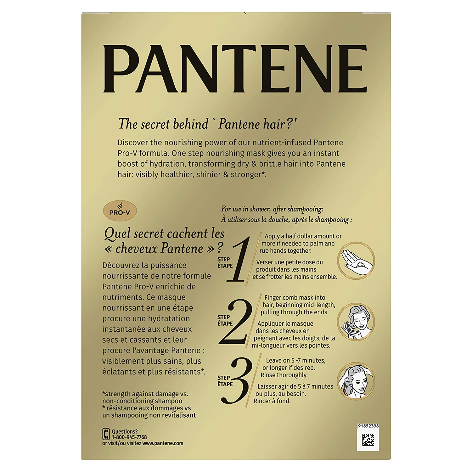 Looking to add some nourishment to your haircare routine? Try our Pantene Pro-V one step nourishing hair mask treatment for an instant boost of hydration. Our nutrient-infused Pro-V formula helps transform dry, brittle hair to be visibly healthier, shinier and stronger for #moregreathairdays. While in the shower, after shampooing, simply apply a half-dollar amount (or more if needed) into your palm and rub your hands together. Comb the mask into your hair with your fingers, beginning mid-shaft and pulling through the ends. Leave the mask on for five to seven minutes, or longer if desired, and rinse thoroughly. Strength against damage vs. Non-conditioning shampoo
