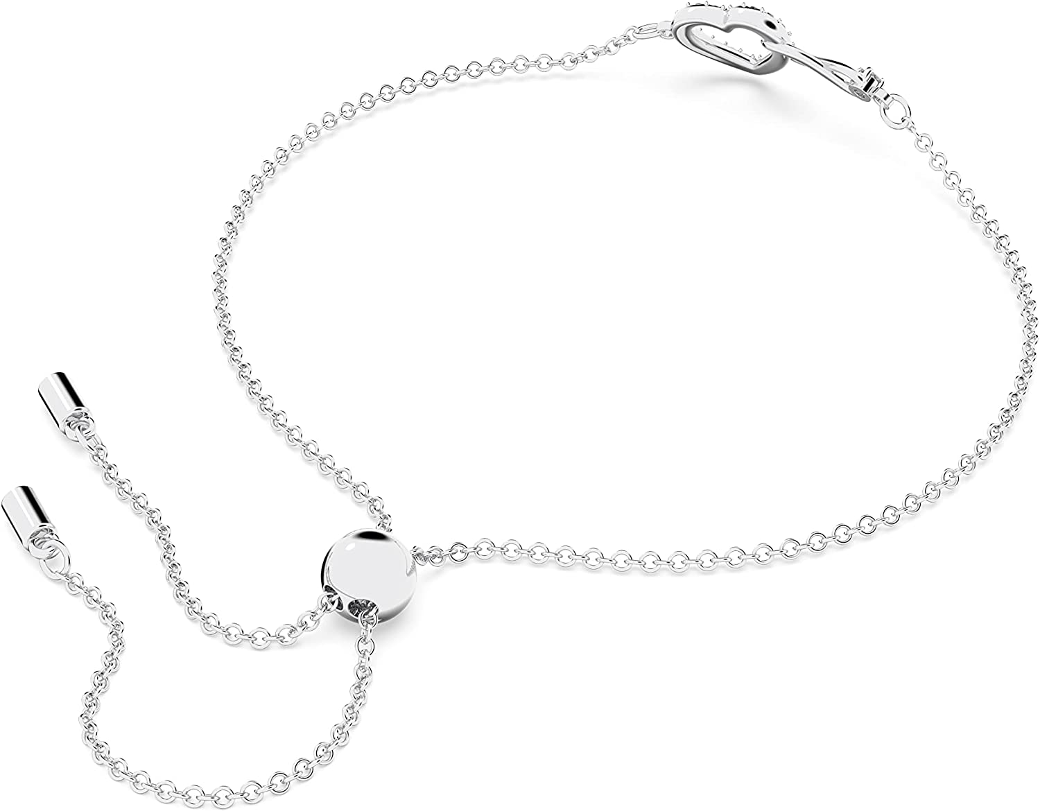 Items delivered: 1 x Swarovski Infinity bracelet for women, 9 3/8 inch rhodium plated chain, white crystal infinity symbol with crystal pavé heart and simple bolo closure, with Swarovski bracelet box