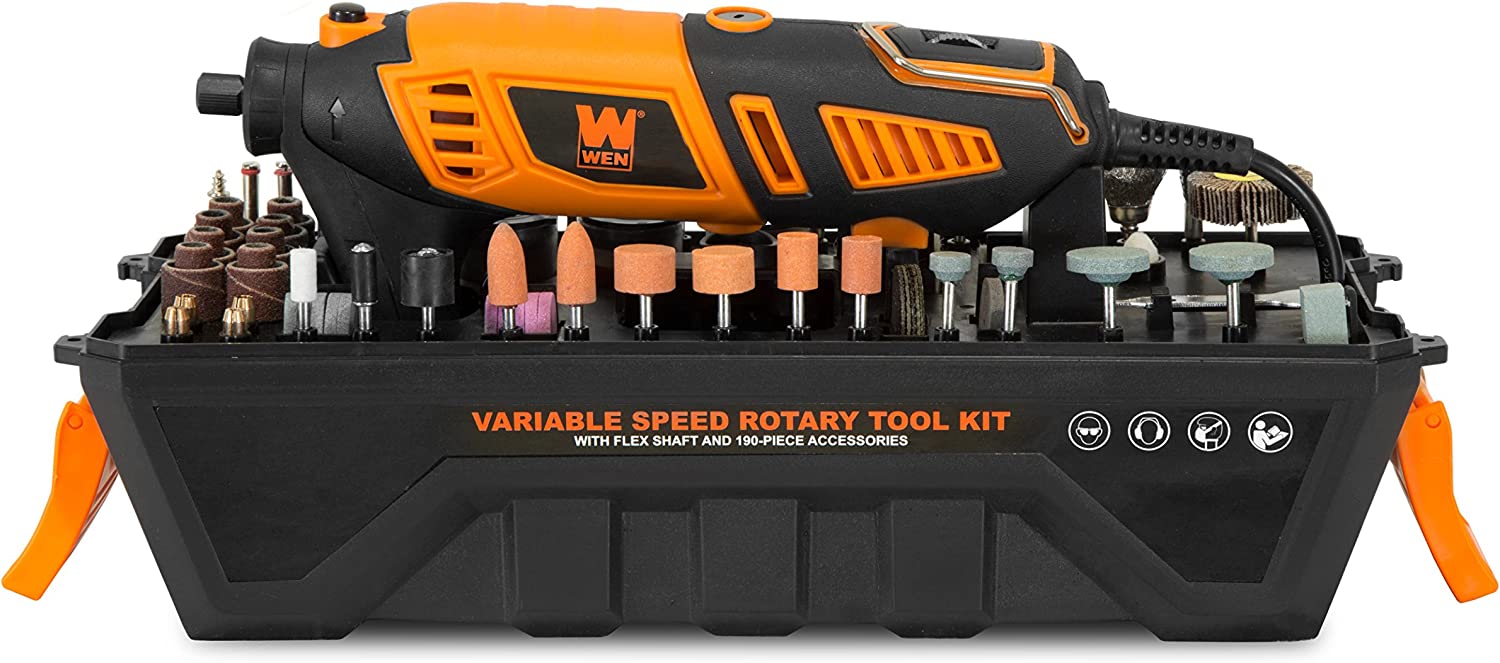 Remember when you had versatility and power all in the palm of your hand? Remove rust from rusty stuff. Trim your dog’s toenails. Engrave beautiful images into your neighbor’s windows while they’re vacationing in Rome. With the WEN Rotary Tool the possibilities are endless, limited only by your imagination and federal law. Equipped with over 190 accessories, this package provides a wide variety of bits and discs to meet the needs of any project. Variable speed can be set anywhere from 8,000 to 35,000 RPM with the simple turn of the speed dial. The handy carrying case makes transportation and storage easier than ever while the lightweight 1.3-pound body limits fatigue during operation. Versatile collet selection allows for bits anywhere from 1/32 of an inch to 1/8 of an inch in size. The removable steady-grip handle provides an alternative method for holding the rotary tool. Its ergonomic design evenly distributes the weight of the tool along the back of your hand, maximizing comfort during long work sessions. Swap the steady-grip handle out for the included flex shaft to help take on intricate and complex designs in glass, plastic, wood, steel and more. And because it is a WEN product. a stocked inventory of replacement parts, and a friendly and helpful phone line. Carve, cut, grind, deburr, engrave, shape, drill, polish and other verbs all with the WEN Rotary Tool Kit. Remember when you had one tool that could do it all? Remember WEN.