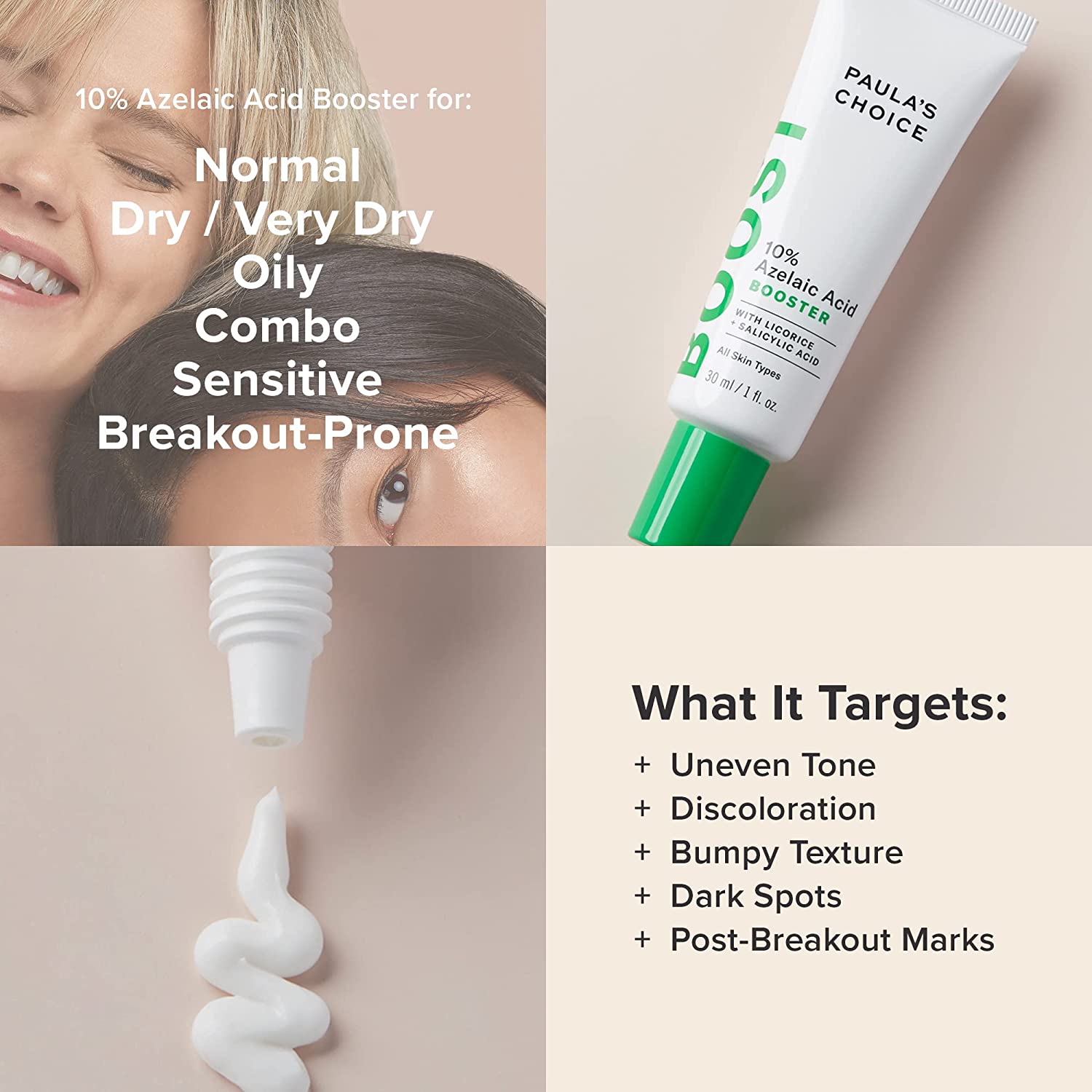 Paula's Choice 10% Azelaic Acid Booster also contains salicylic acid (BHA) a gentle exfoliator. The multi-tasking formula boasts a lightweight, oil-free texture that works beautifully on its own or mixed with other acne treatments, like benzoyl peroxide.