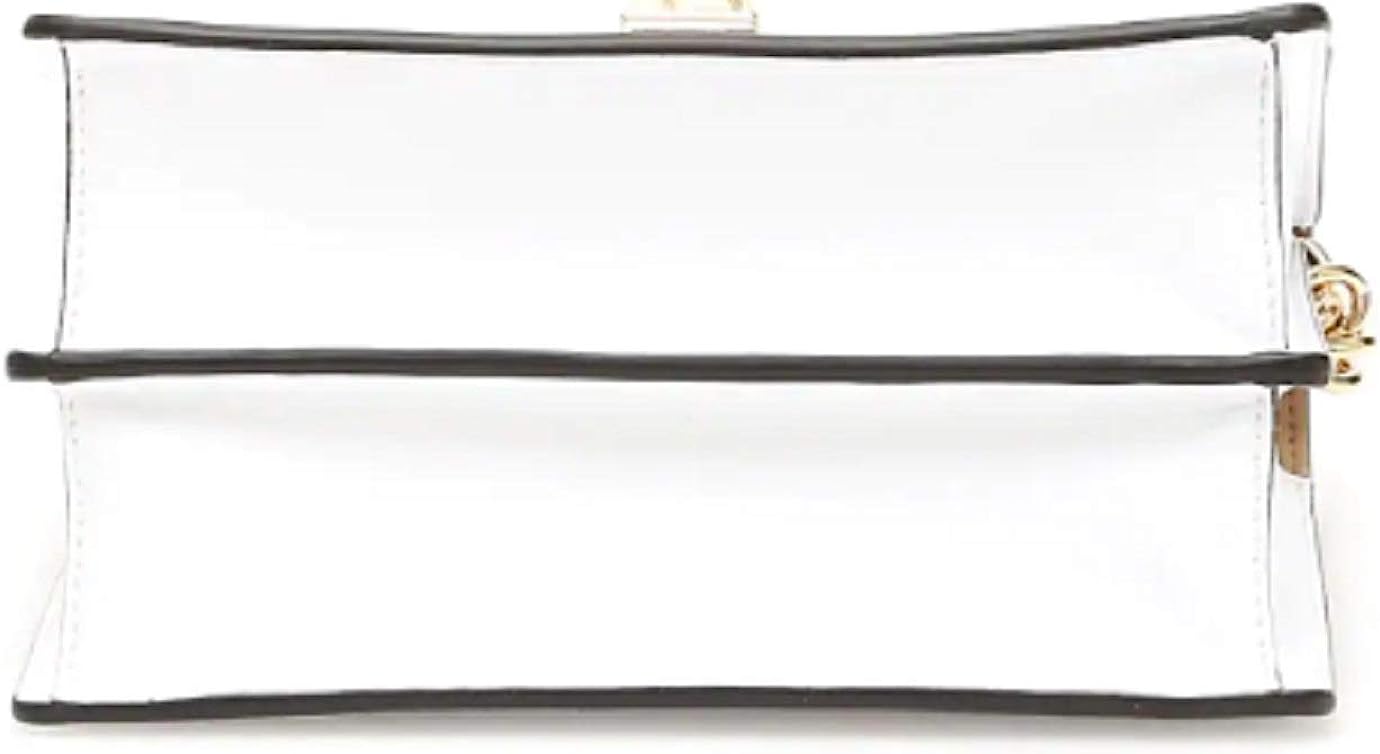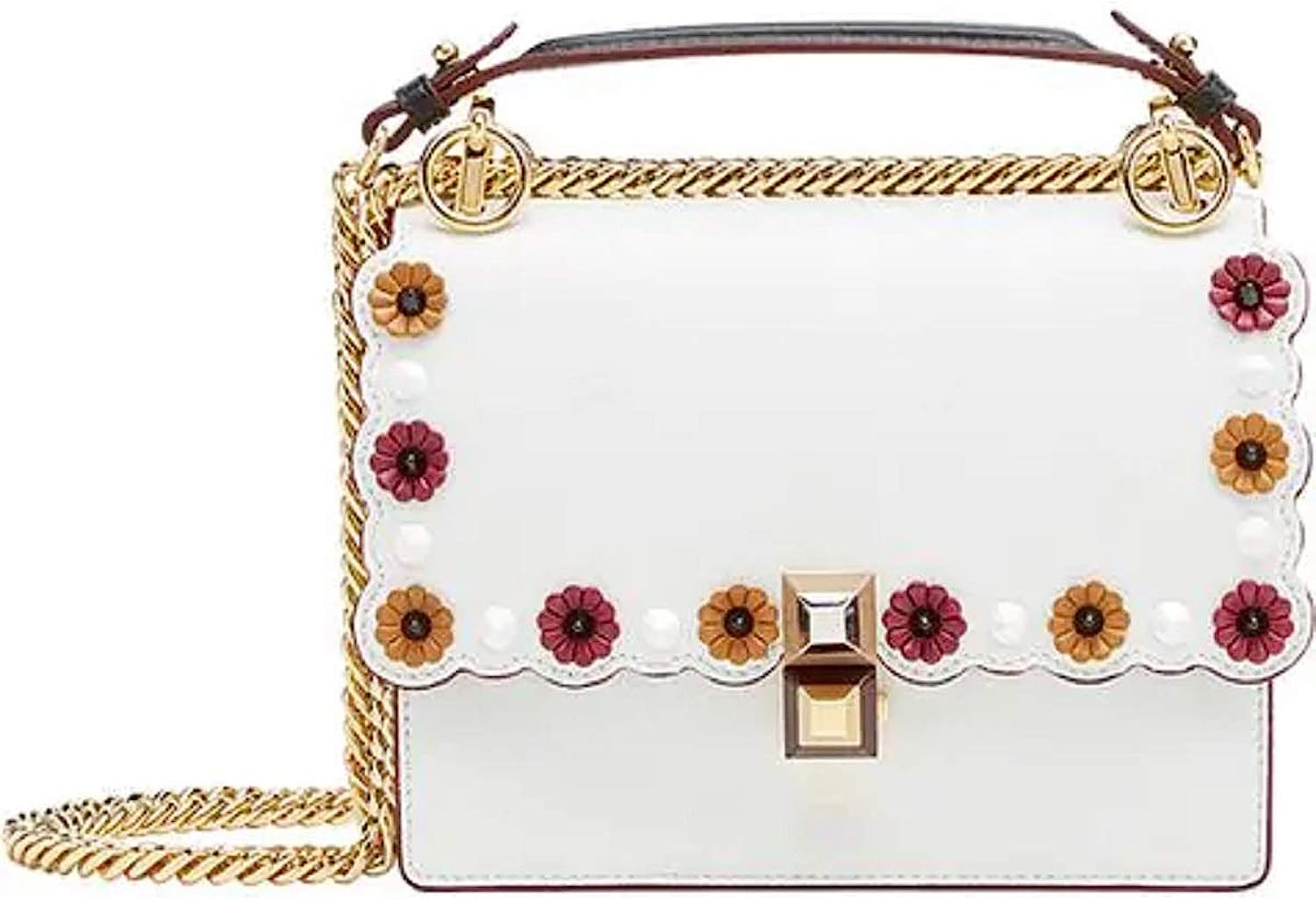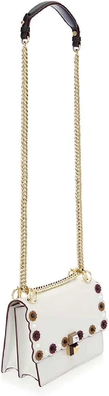 This shoulder bag is crafted of smooth calfskin leather in white. This shoulder bag features faux beige and burgundy flowers on scalloped edges, a shoulder strap and polished gold rings on the anchor to hold bag charms.