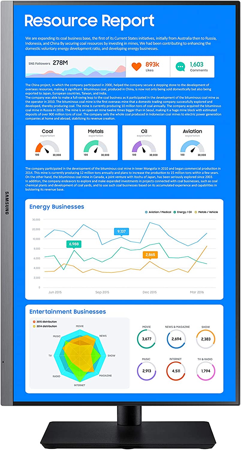 Samsung Business's SR650 Series business monitors utilize enhanced IPS panel technology to preserve color vividness and clarity across every inch of the screen, with up to 178° viewing horizontally and vertically. The virtually bezel-less screen lets you view more, with almost no gap in a dual monitor setup. And with features, versatile connectivity and a fully adjustable stand, the SR650 Series is an ideal cost-effective monitor for your business.