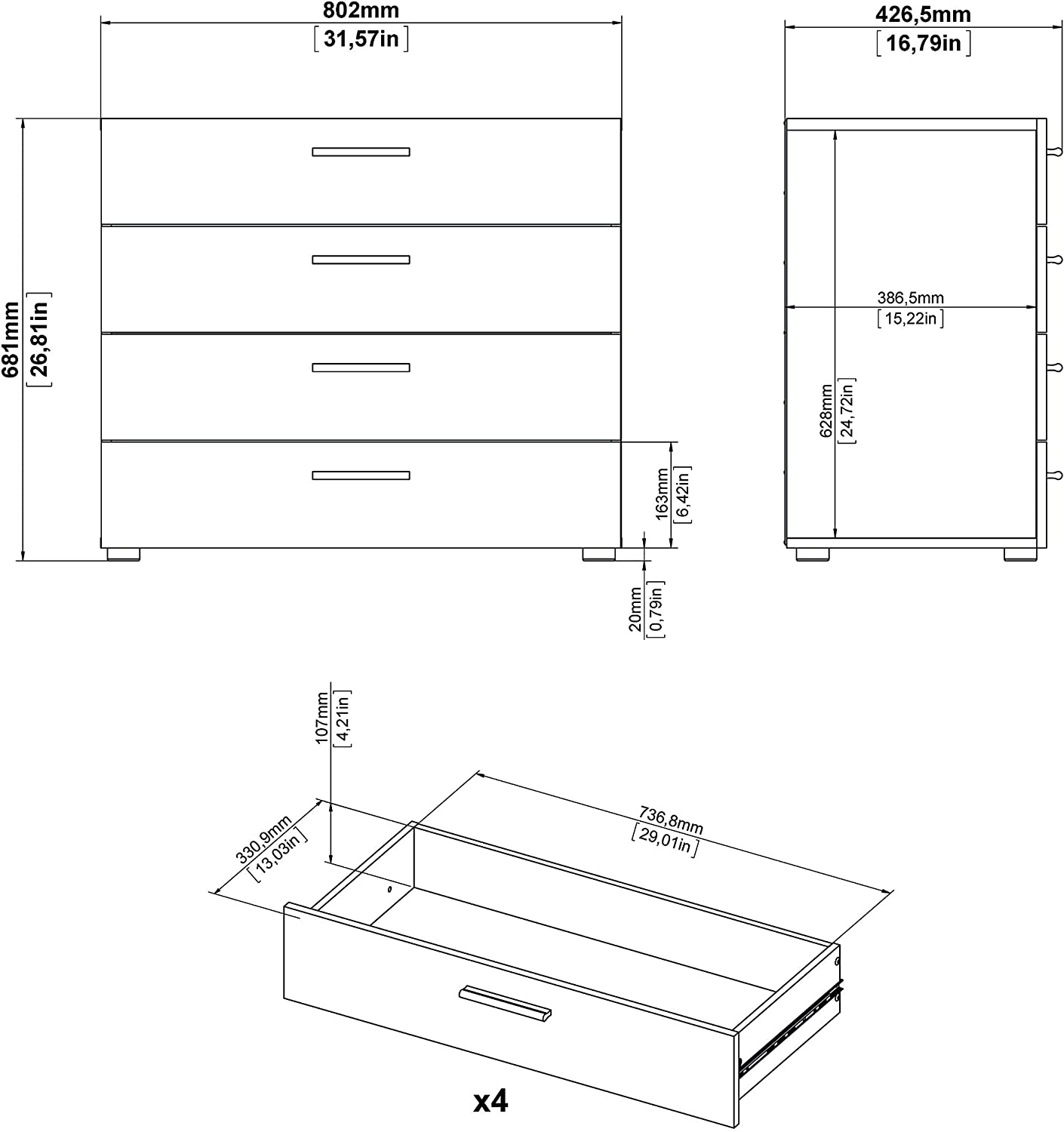Four drawers for storage, Steel brackets add support to bottom of drawers