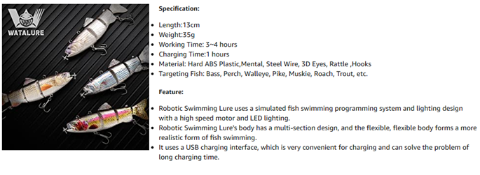 • ?【Freshwater lure】Robotic Swimming Lure is used with floats and leader line to keep Robotic Swimming Lure swimming in the water, solving the problem that Lure is easily entangled by underwater debris. Use different lengths of front wires at different water depths to keep the waters of Robotic Swimming Lure in your control.