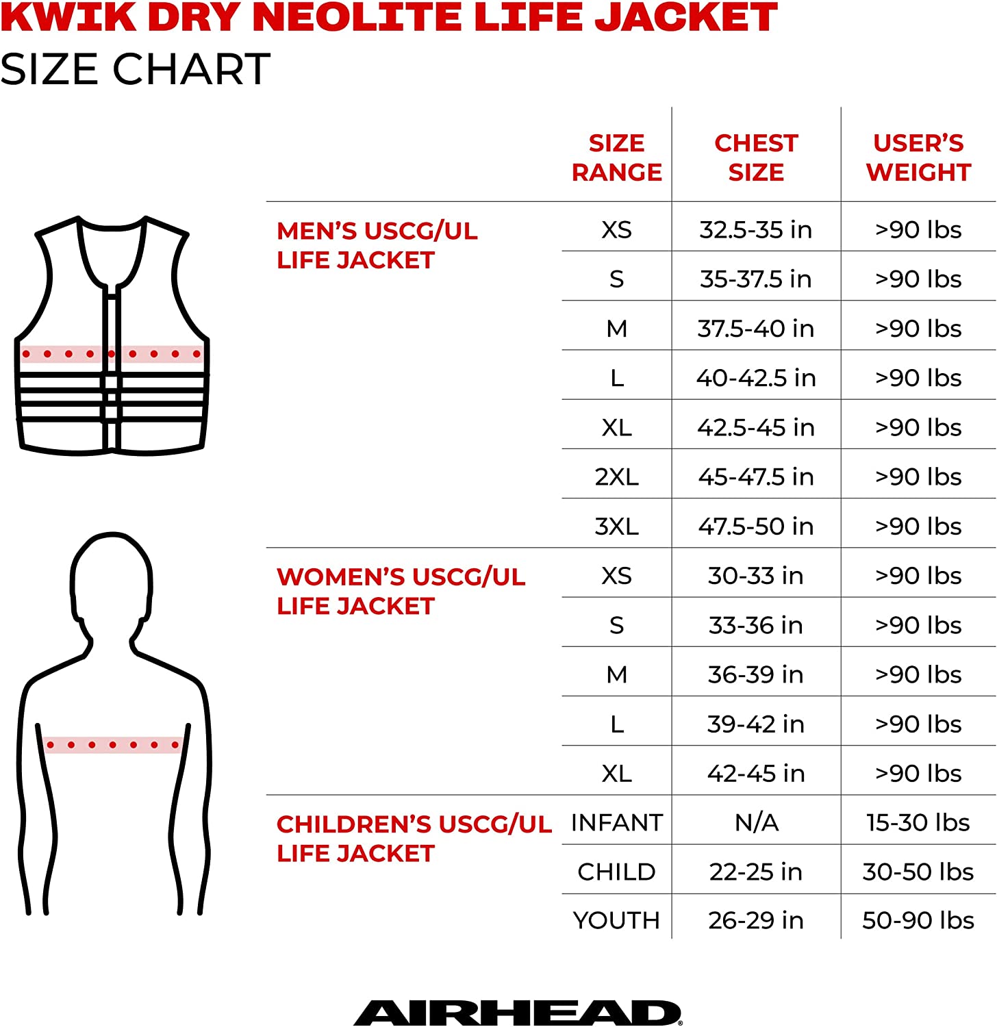 SIZING – This life jacket follows the sizing determined by the USGC and is designed to fit adults that weigh over 90 pounds and have a 47.5-50 inch chest size for the ADULT size and Youth 50-90 pounds with a 26-29 inch chest in YOUTH sizes. If you are unsure or in between sizes, select a larger size