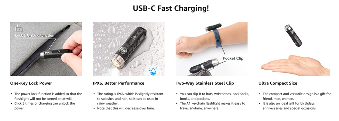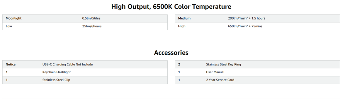 • [ USB-C Charging]: 300mAh battery that can be charged via the USB-C port, when working at moonlight mode, it provides max runtime of 56 hours. Making this keychain flashlight higher output and runtime. (USB-C charging cable not included)