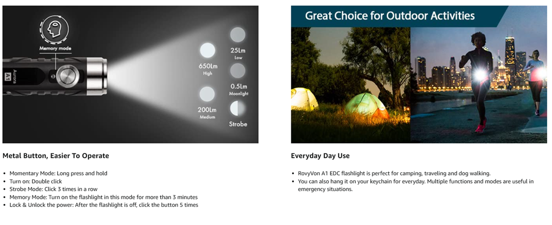 • [ Better Operation ] Added one-key lock function. Click the button for 5 times to lock the power and prevent the key flashlight from automatically turning on. Long press to turn on momentary mode. Quick double click the button turns the flashlight on from memory mode. (Moonlight-Low-Mid-High)