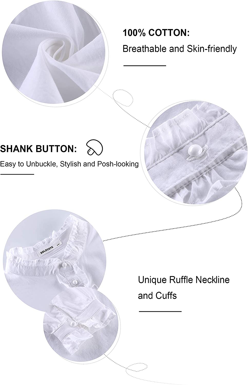?Ruffle decorated collar, placket and cuff ? Semicircle button of mushroom on placket