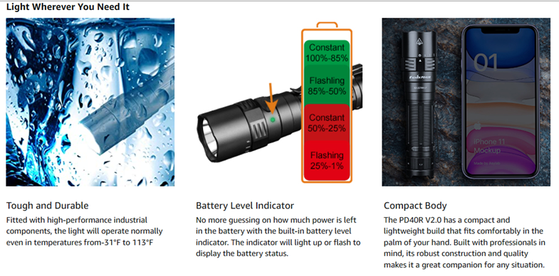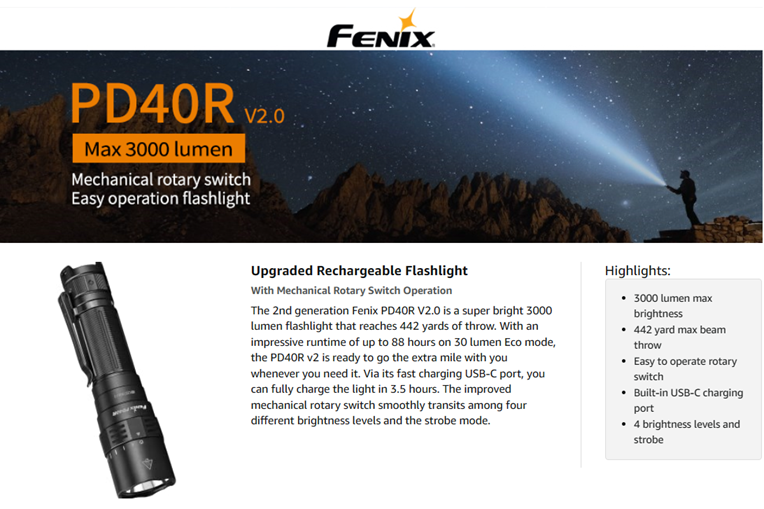 • HIGH CAPACITY POWER AND RECHARGEABLE - The PD40R v2 has a fast charging USB-C port to fully charge the flashlight within 3.5 hours, ready to go the extra mile whenever you need it.