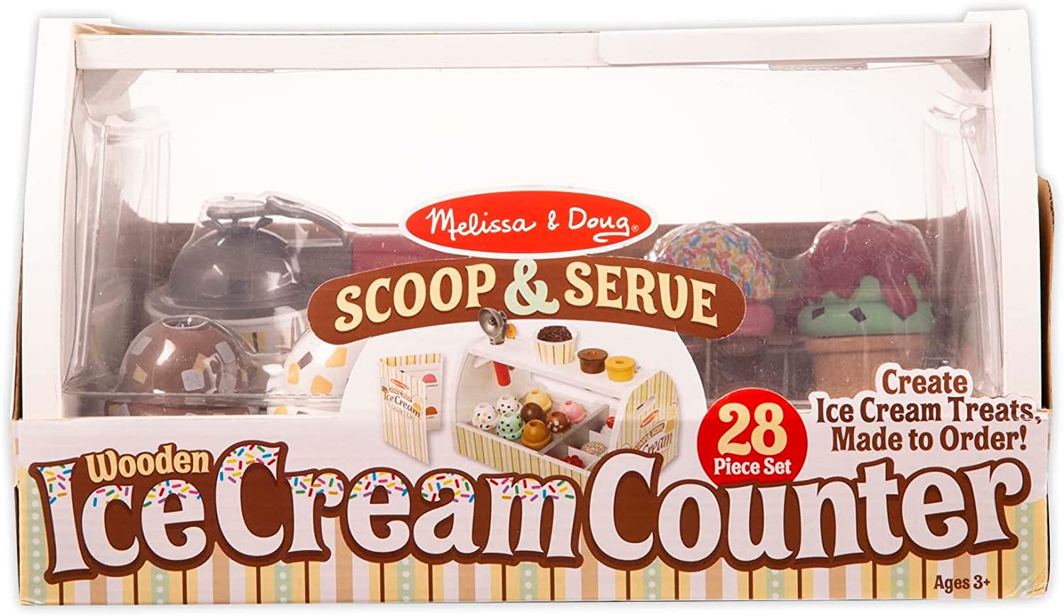 Scoop up some cool treats with this all-inclusive, 28-piece pretend play ice cream counter! The sturdy wooden tabletop counter holds eight wooden scoops of different-flavored ice cream, six assorted toppings, two cones, a plastic cup, an ice cream scooper, tongs, and a wooden spoon. The scooper fits into a hole on top of the scoops to lift, stack, and release. Take orders on the reusable menu card, pay with play money, and serve up delicious fun! This 28-piece wooden ice cream play set allows children 3 and up to scoop different flavors of ice cream and interact with their friends in a playful social environment. The scooper is easy to use and replicates the realistic action of serving ice cream. The Wooden Scoop & Serve Ice Cream Counter makes a great gift for kids ages 3 and up. For more dessert-making fun, consider adding the Melissa & Doug Wooden Make-a-Cake mixer set or the Melissa & Doug Bake & Decorate Cupcake set. This kids ice cream station contains 28 pieces with packaging that measures 13.6" x 7.7" x 8.6". For more than 30 years, Melissa & Doug has created beautifully designed imagination- and creativity-sparking products that NBC News called “the gold standard in early childhood play.” We design every toy to the highest-quality standards, and to nurture minds and hearts.