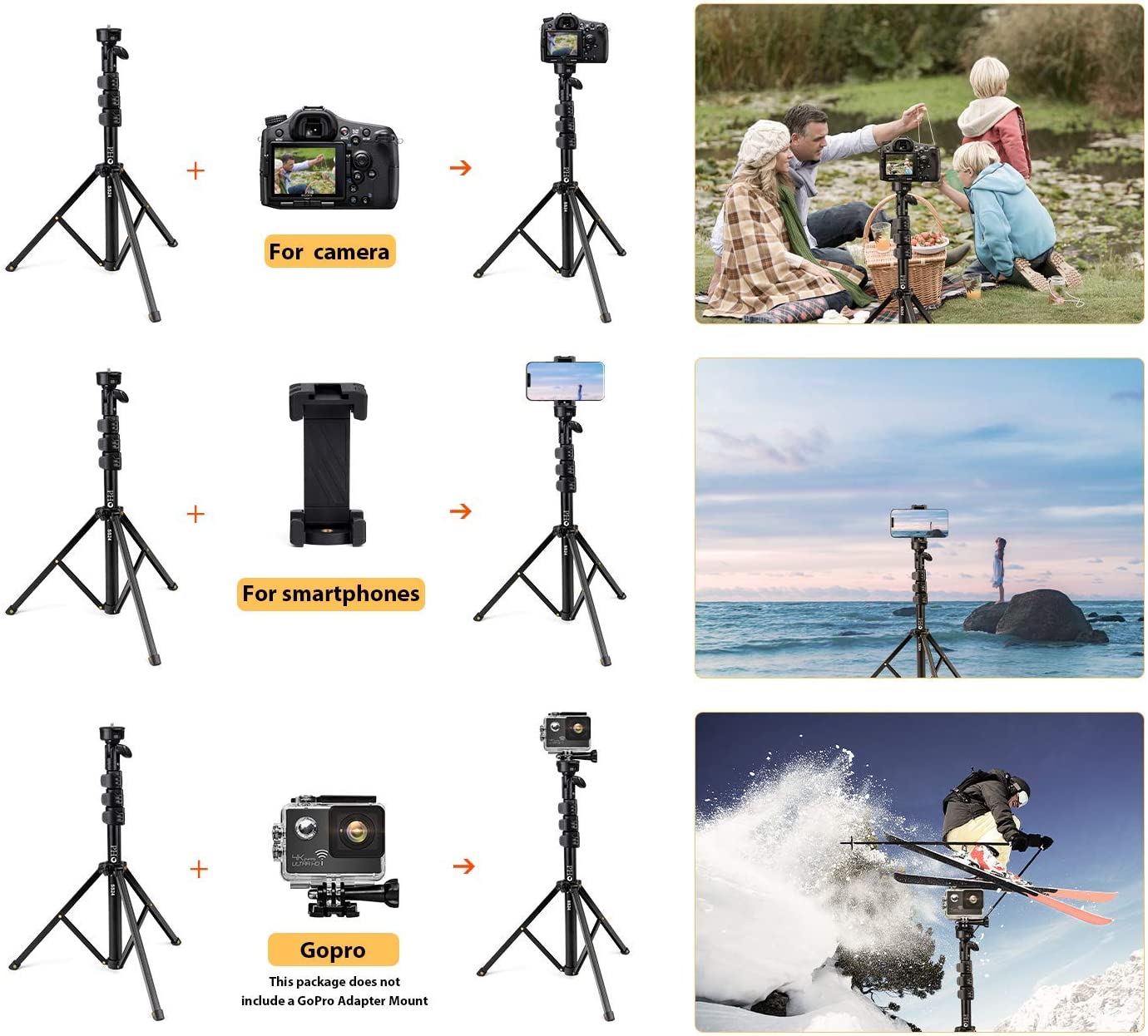 【Expandable and Foldable】This tripod has 3 adjustable quick-turn leg locks, 4-stage upright legs with quick-release lever locks that allow you to adjust the working height from 16 inches to 55 inches in seconds , The height-adjustable 55" light tripod is 5" longer than other common tripods and can be quickly set up/removed for a variety of shooting environments and photography needs