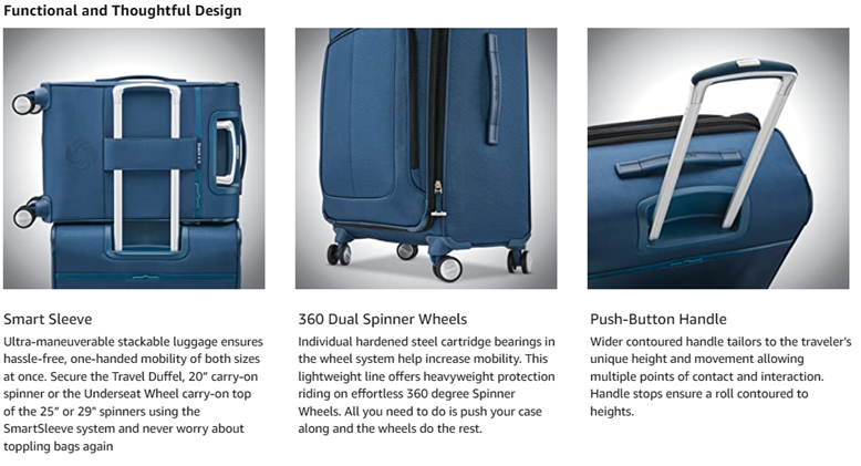 • FOUR MULTI-DIRECTIONAL double spinner wheels allow 360 degree upright rolling so there is no weight on your arm or shoulder