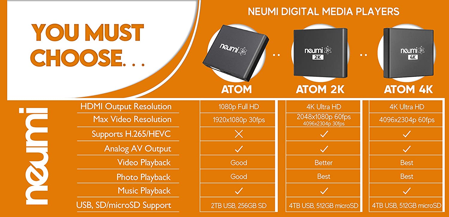 NEUMI Atom 4K Ultra-HD Digital Media Player for USB Drives and SD Cards - Plays 4K/UHD 60fps Videos, HEVC/H.265, HDMI and Analog AV, Automatic Playback and Looping Capability