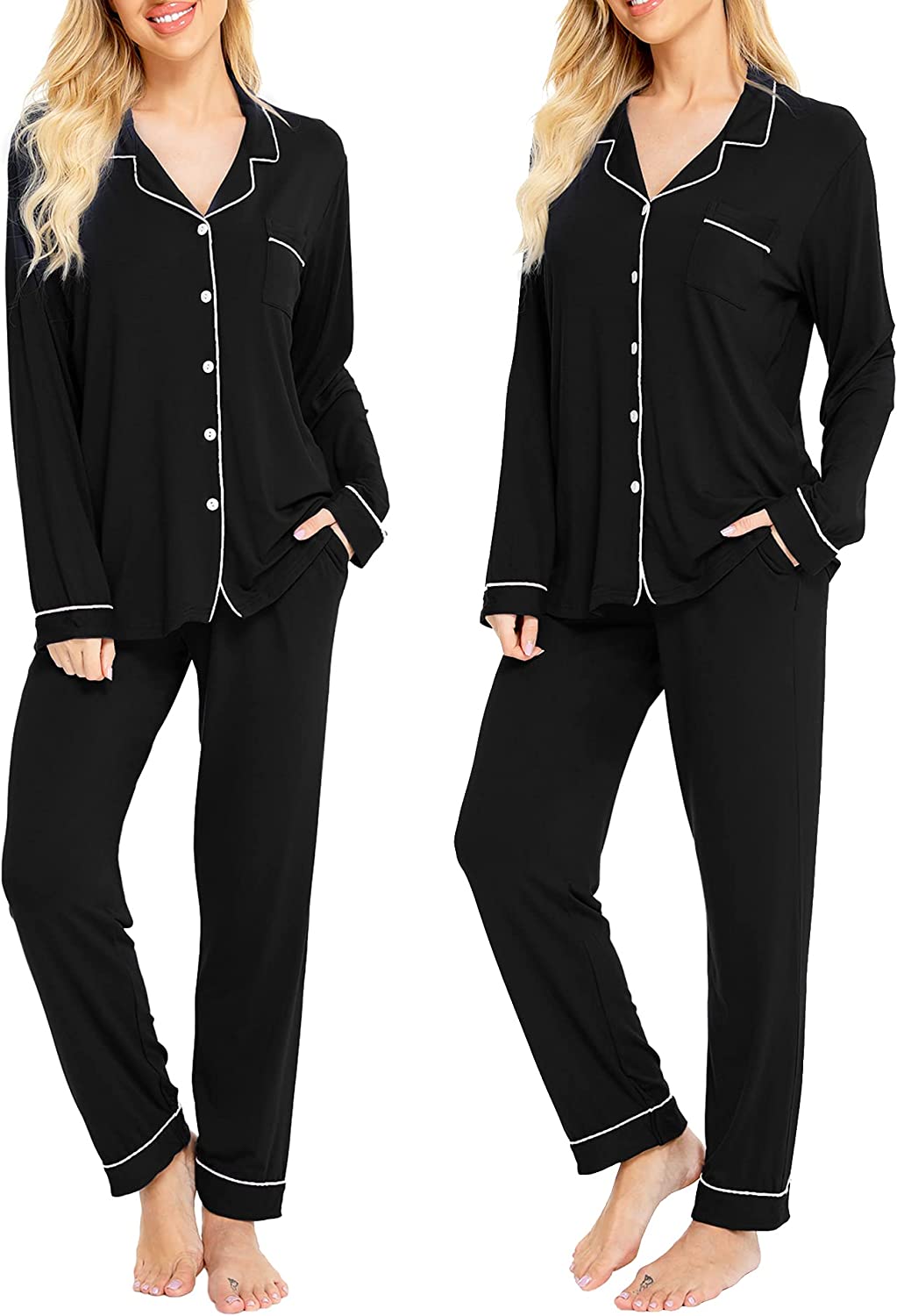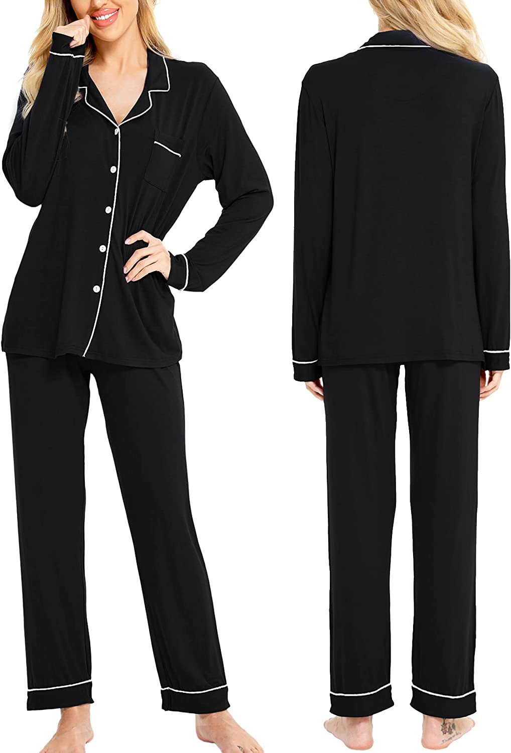 ❤TWO-PIECE CUTE SLEEPWEAR:Our pajama set consist of long sleeve boyfriend style top and long pant.Notch collar and the button-front top with a chest pocket and contrast piping,drawstring elastic waistband makes it fit better.Enjoy your next pajama party in this comfy soft PJ set