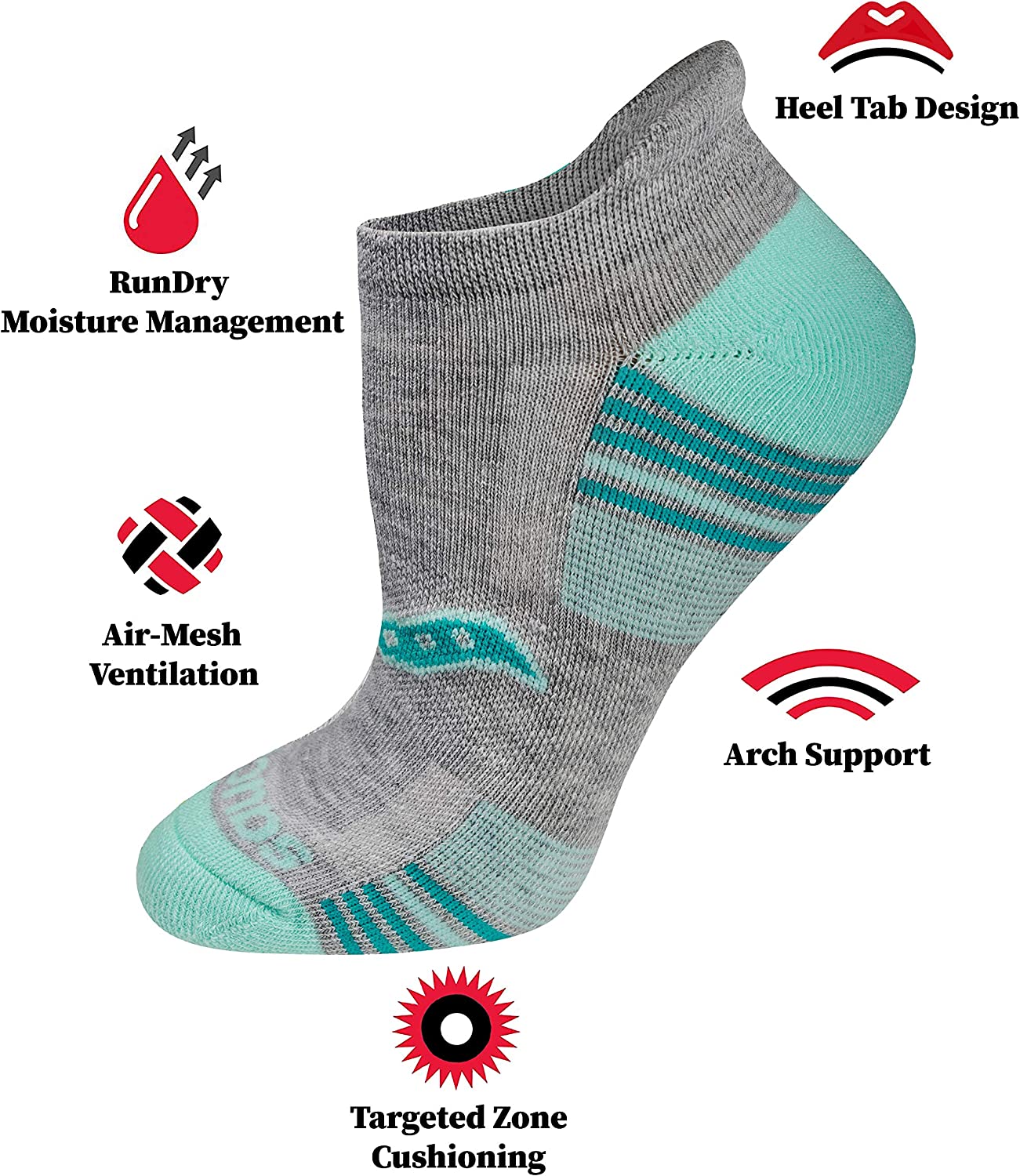 Saucony women's performance Heel tab athletic socks are a perfect combination of comfort and support. Great for the toughest training sessions. Features include heel tab design for added protection and comfort, rundry moisture management helps keep feet dry, arch support for an improved and secure fit, Mesh ventilation that enhances breathability and comfort, targeted zone cushioning in high impact areas for added comfort, and comfort toe seam for reduced irration.