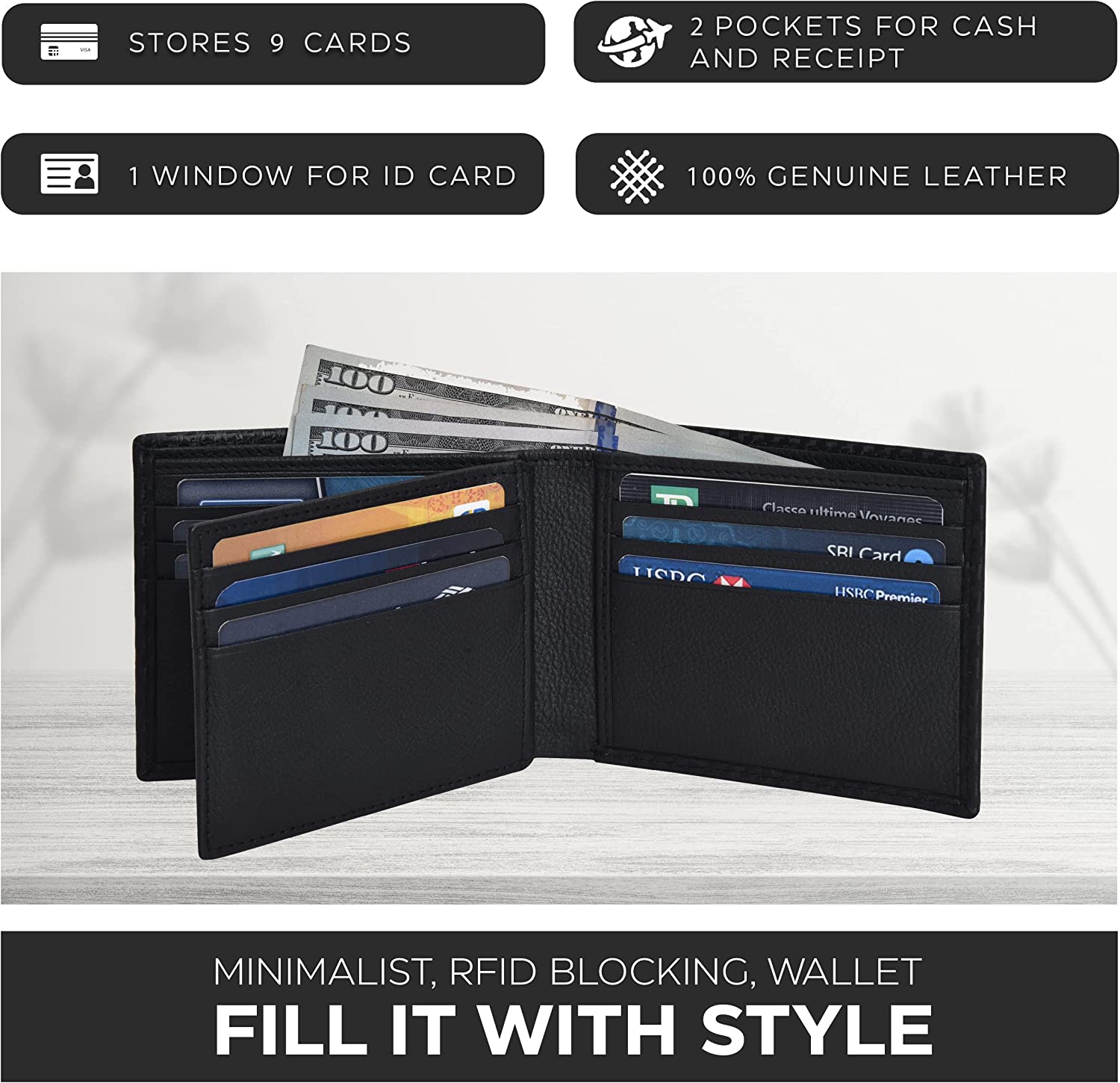 - EXCELLENCE OF CRAFTSMANSHIP DELIVERED – This leather bifold wallet is a true minimalist with a rich and premium feel of leather. The wallet shines out with your personality and makes a good companion which lasts long. This bifold has a minimalist design but with an impressive capacity. 9 credit cards, 1 ID card holder, 2 currency bills compartment and 2 documents holders and yet measures only 3.5 x 4.35 x 0.75 inches.