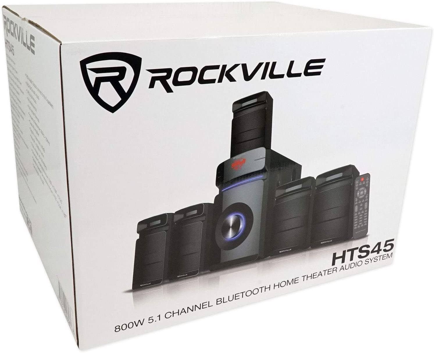 Rockville HTS45 800w 5.1 Channel Bluetooth Home Theater Audio System+Subwoofer. 800 Watts Peak Power. 400 Watts Program Power. 200 Watts Continuous RMS Power. 5.25” Subwoofer with Built-In Receiver. 3” Center Channel Speaker. 3” Full Range Front Speakers. 3” Full Range Rear Channel Speakers. Top Quality MDF Wood Cabinets with Plastic Front Panels. Built-In FM Receiver with Amazing Reception. 5 Preset Equalizer curves. You can independently control the volume of each speaker and the subwoofer. Bluetooth v5.0. Optical Input. Coaxial Input. USB Input (max file size 64Gb). SD Input (max file size 64Gb). 2 ¼” MIC Inputs with Echo function for karaoke. 5 RCA Audio Outputs connect to the 5 speakers