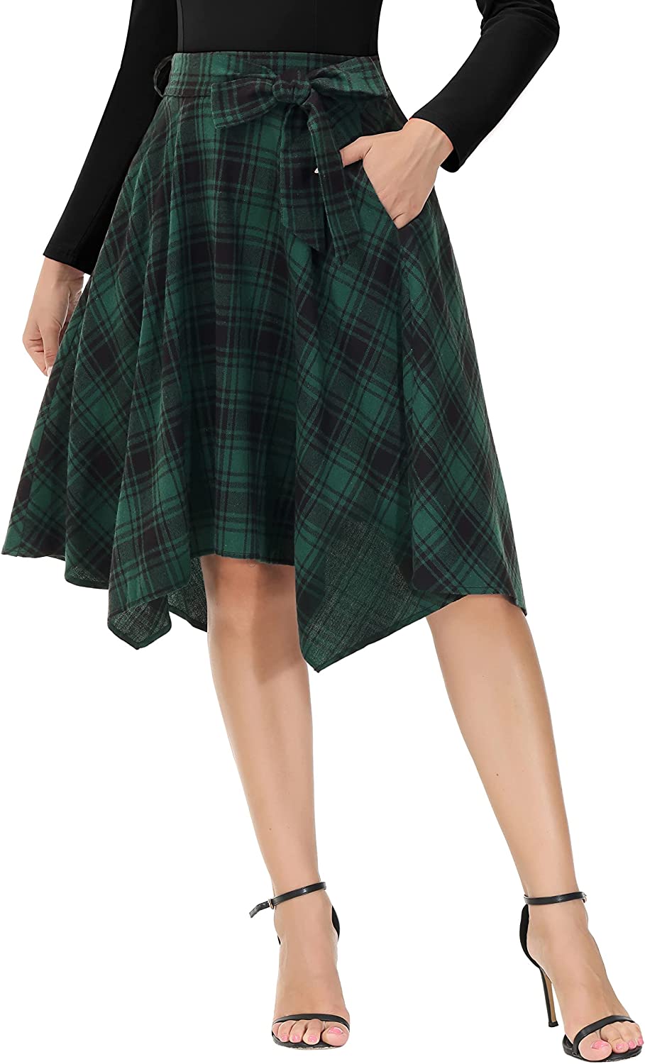 Women Skirt Features: Plaid Parttern, Stretchy Waist, 2 Open Pockets, A Line Silhouette, Belt, Soft farbic,Very Comfortable to wear