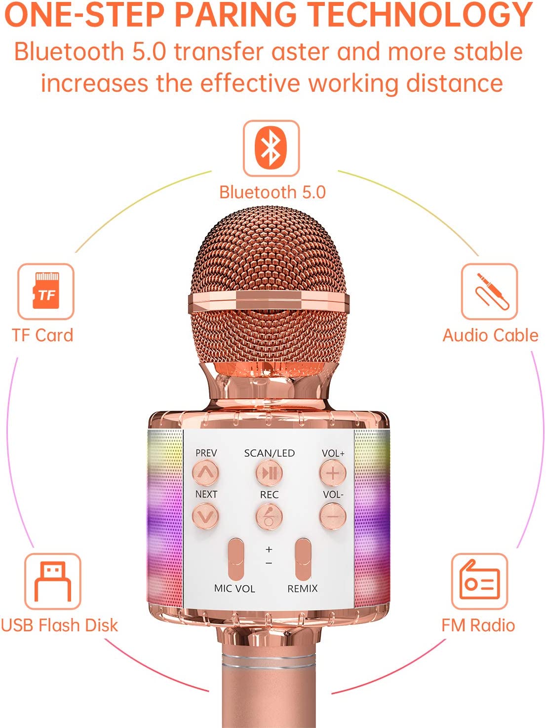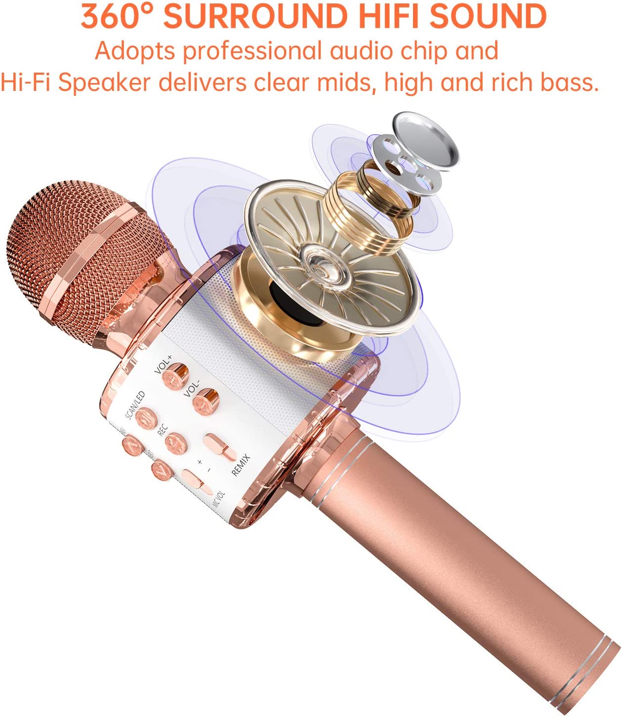 OVELLIC Karaoke Microphone for Kids, Wireless Bluetooth Karaoke Microphone with LED Lights, Portable Handheld Mic Speaker Machine, Great Gifts Toys for Girls Boys Adults All Age (Rose Gold)
