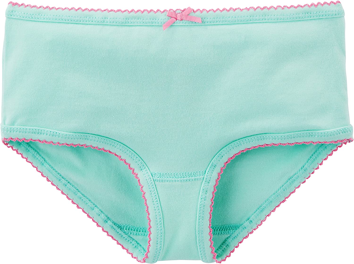 Bows, lace trims, and bold prints decorate this eight-pack of cotton panties for active girls.
