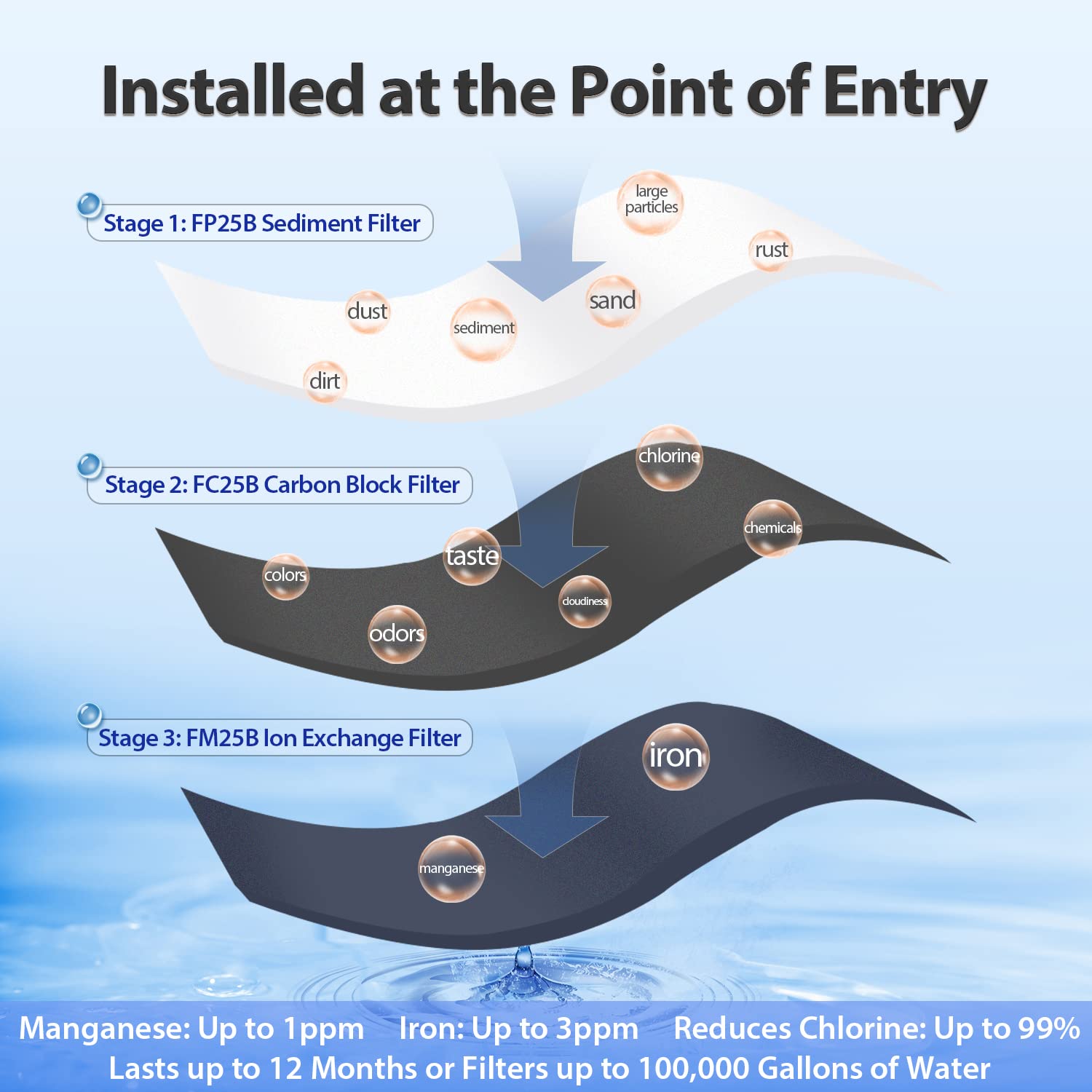 Whole house water filter that protect your family and household appliance from iron, manganese and more: Our 3rd stage iron water filter (FM25B) is specially designed for iron and manganese removal, reducing iron (MAX 3.0 ppm) and manganese (MAX 1.0 ppm). The water filter lasts up to 3 times longer than greensand due to the catalytic media not being consumed in the process. This whole house water filter system also removes sediment, chlorine, rust, herbicides, industrial solvents, and more.