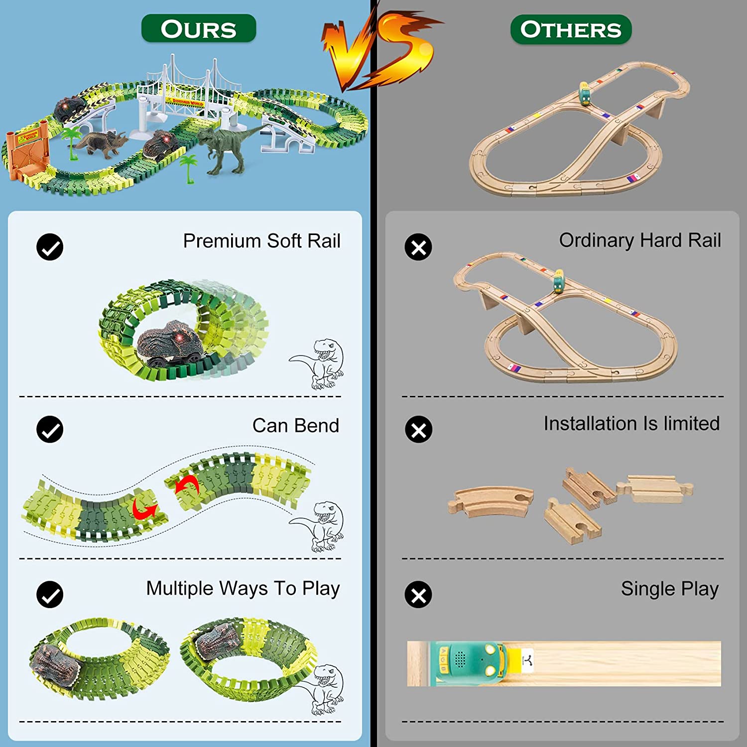 Ample Package Content: The dinosaur train toys package comes with 144pcs tracks, 4 trees, 2 dinosaur cars, 2 dinosaurs, 2 ramps, 1 gate, 1 bridge and 4 replacement tire treads, create dinosaur world road racetoys environment, incredible birthday toys gifts for kids.