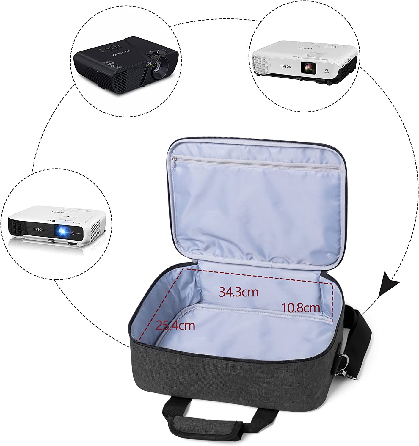 LARGE STORAGE SECTION: The main compartment can secure the device. There is also an inner zipper pocket to put the instructions. This projector bag fits for Epson (VS240, VS250, VS350, VS355, EX3240, EX3260), BenQ (MH530FHD, MH535FHD), ViewSonic (PJD7720HD, PJD7828HDL, PJD5255). For projectors of other models and brands, please refer to the size of bottom part.