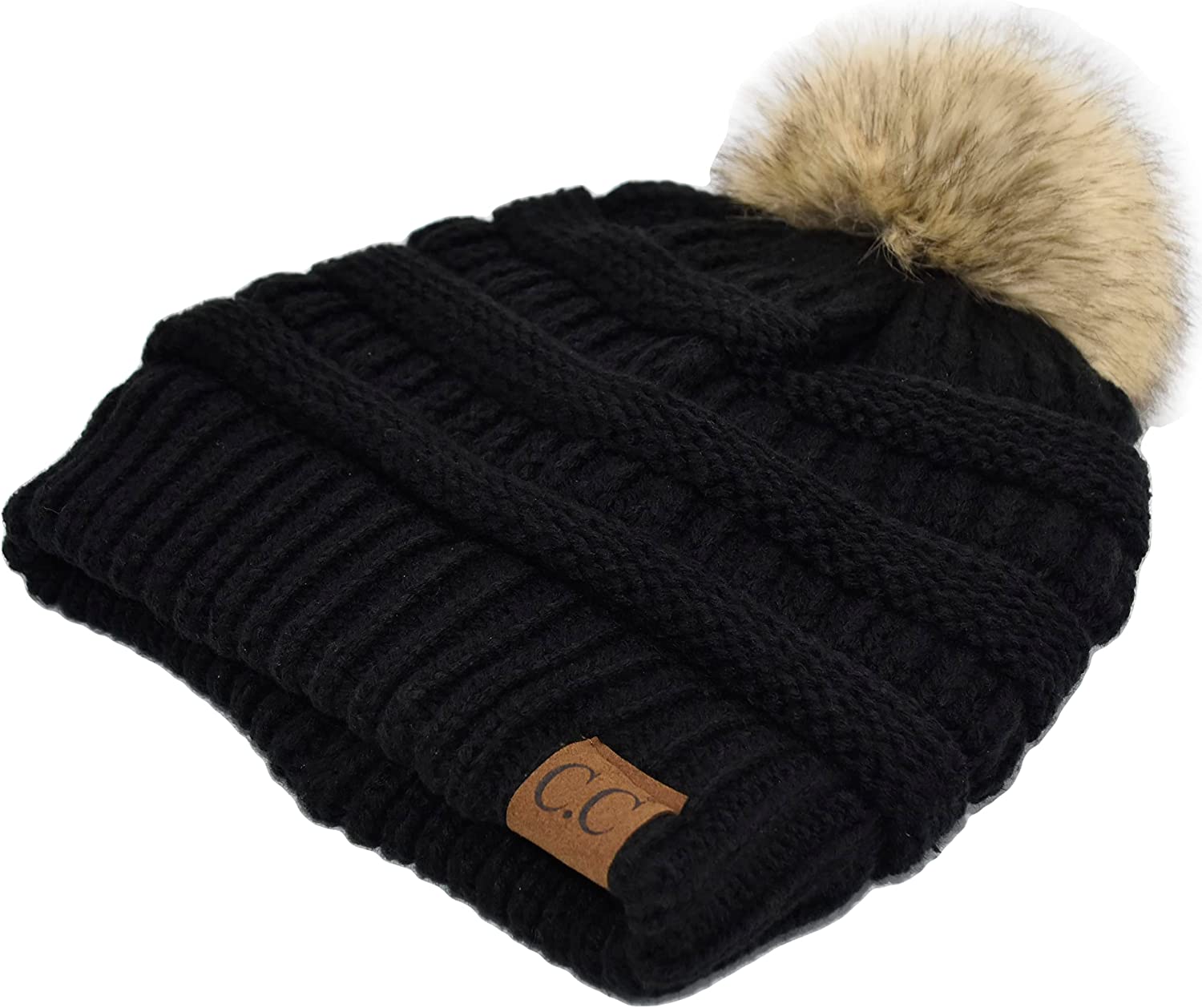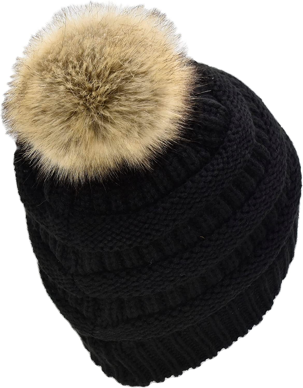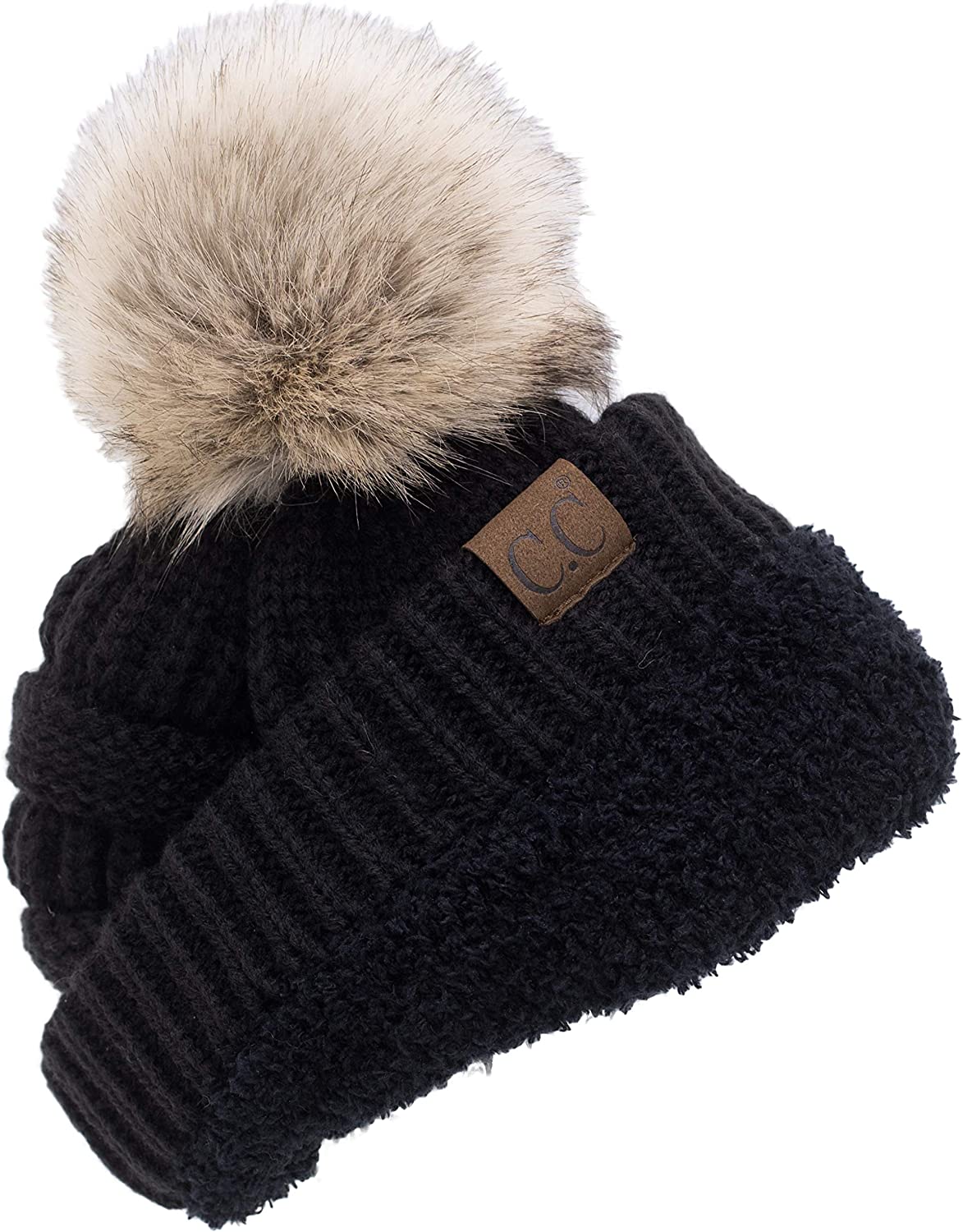 C.C Trendy Warm Soft Stretch Cable Knit Ribbed Faux Fur Pom Pom Fuzzy Sherpa Fleece Lined Skull Cap Cuff Beanie Hat