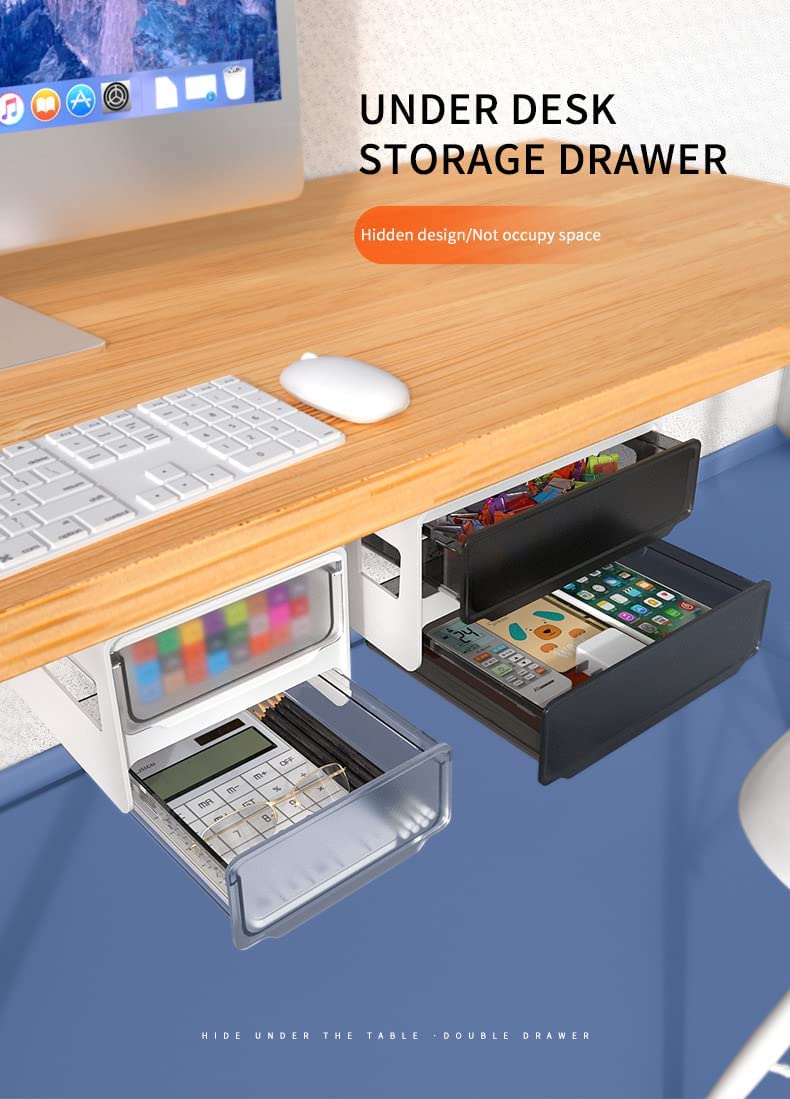 【Self Adhesive & Easy to Install】With four strong-power self-adhesive tapes, this under desk drawer organizer is easy to mount to the clean surface tightly and will not drop-off. Screws are also included if the tapes do not work.You can choose a suitable location, choose a smooth panel, and paste our drawers.Please hot the tape with a hair dryer first or use some degumming agent and rip it off if you want to remove the drawer.