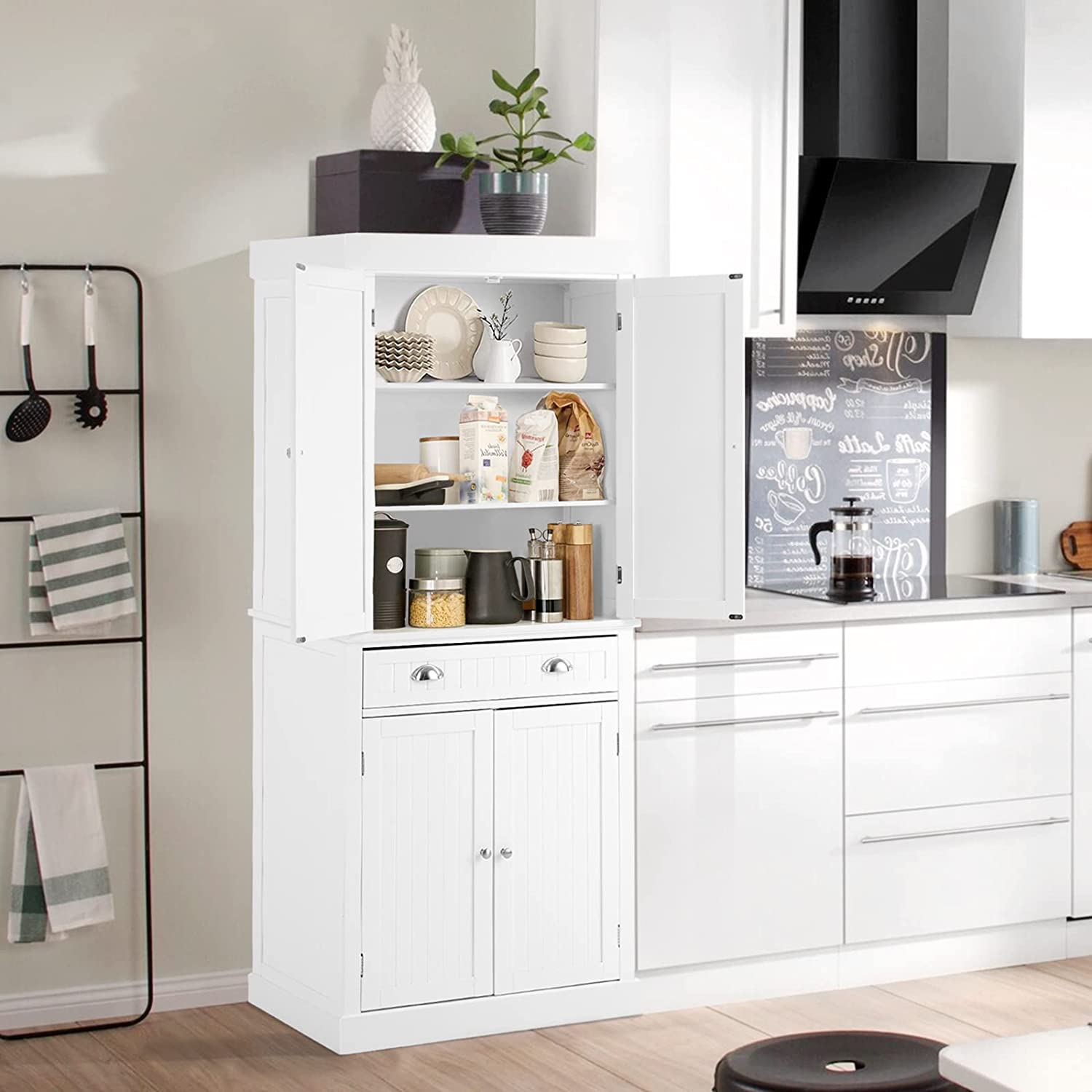 【STORAGE SPACE TO MEET DEMAND】This kitchen pantry is equipped with a large drawer and 2 double-door cabinets. There are three adjustable shelves inside the cabinet, and you can easily adjust the height of the shelves according to the different items you need to place. Different heights can meet the placement needs of various items. The drawer is equipped with smooth sliding rails, which can be easily opened and closed. You can put dishes, books and other small items in the spacious drawer.