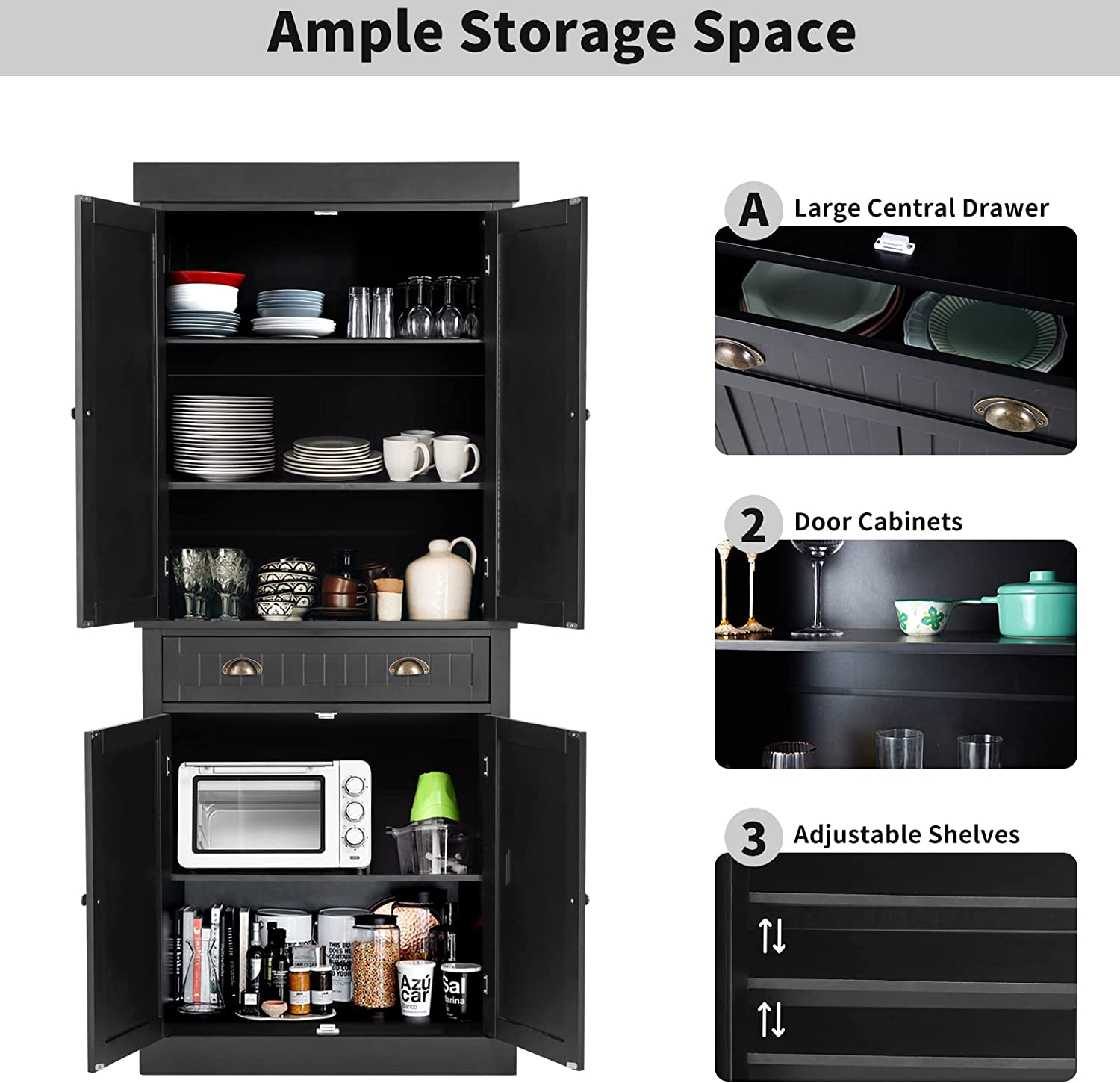 YOLENY Kitchen Pantry, 72” Freestanding Storage Cabinets with Doors and Shelves, Elegant Colonial Design Cabinet Cupboard with 3 Adjustable Shelves and 1 Storage Drawer,Black