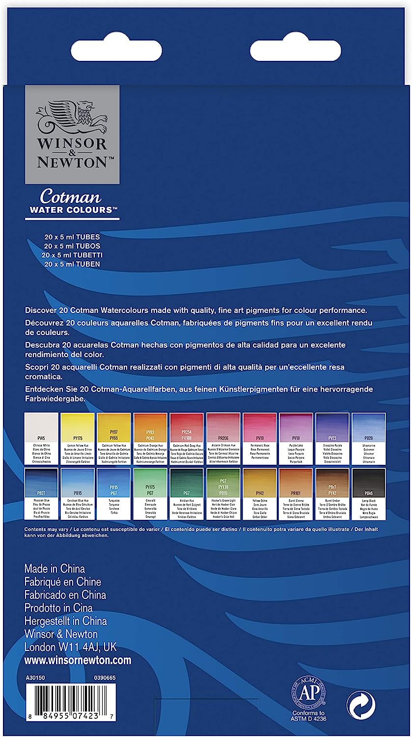 - This set contains 20 essential starter colors for beginners. Cotman colors are formulated for high transparency and provide outstanding lightfastness. For specific effects use with Winsor & Newton watercolor mediums.