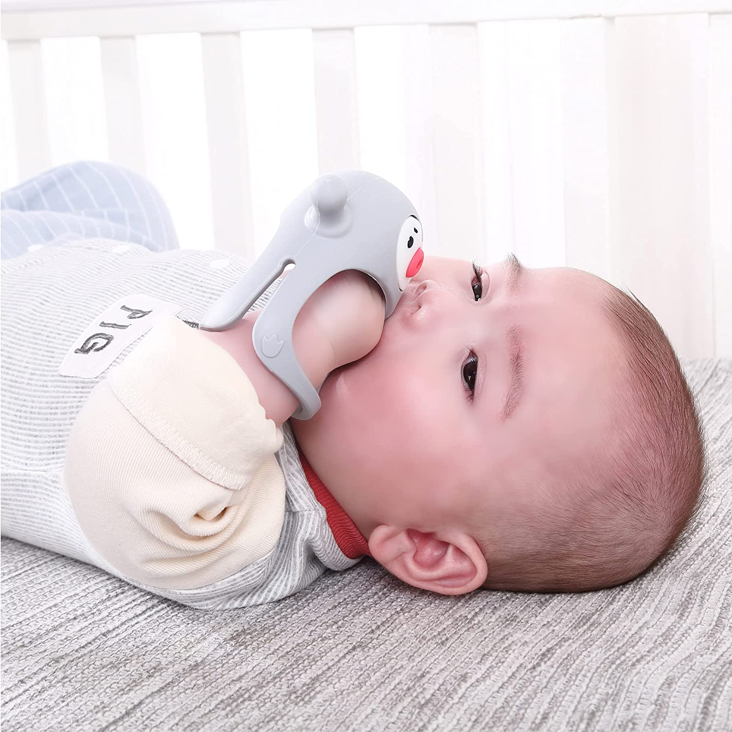 Smily Mia Penguin Baby Teething Toys for 3-6Months, Infant Handheld Pacifiers 0-6Months, 3Months Old Baby Must Haves, 4months Old Toys for Babies, Light Grey…