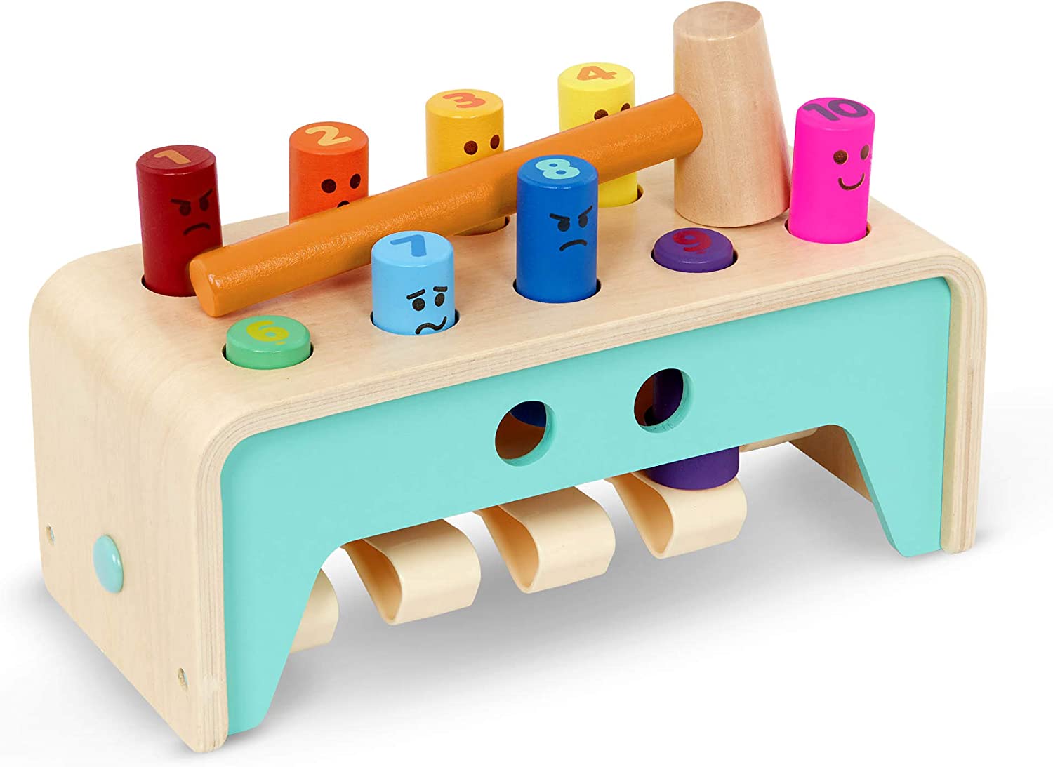 Peek-a-boo! The Pound & Count Bench by Battat comes with 10 colorful pegs and a tiny hands-friendly mallet to pound them down with. As your kiddo plays with this wooden pounding toy, they’ll be getting a hands-on lesson on the concept of cause-and-effect – when they tap the hammer on a peg, they’ll see another one pop up! Your little one can explore numbers, colors, and emotions with these fun pegs. With 5 different facial expressions to discover, this developmental toy can be used to build your kiddo’s emotional skills! When play time is over, easily store the mallet in the holes on either side of the bench. Made of worry-free and durable materials, all Battat products meet or exceed EU, U. S. and Canadian safety standards.