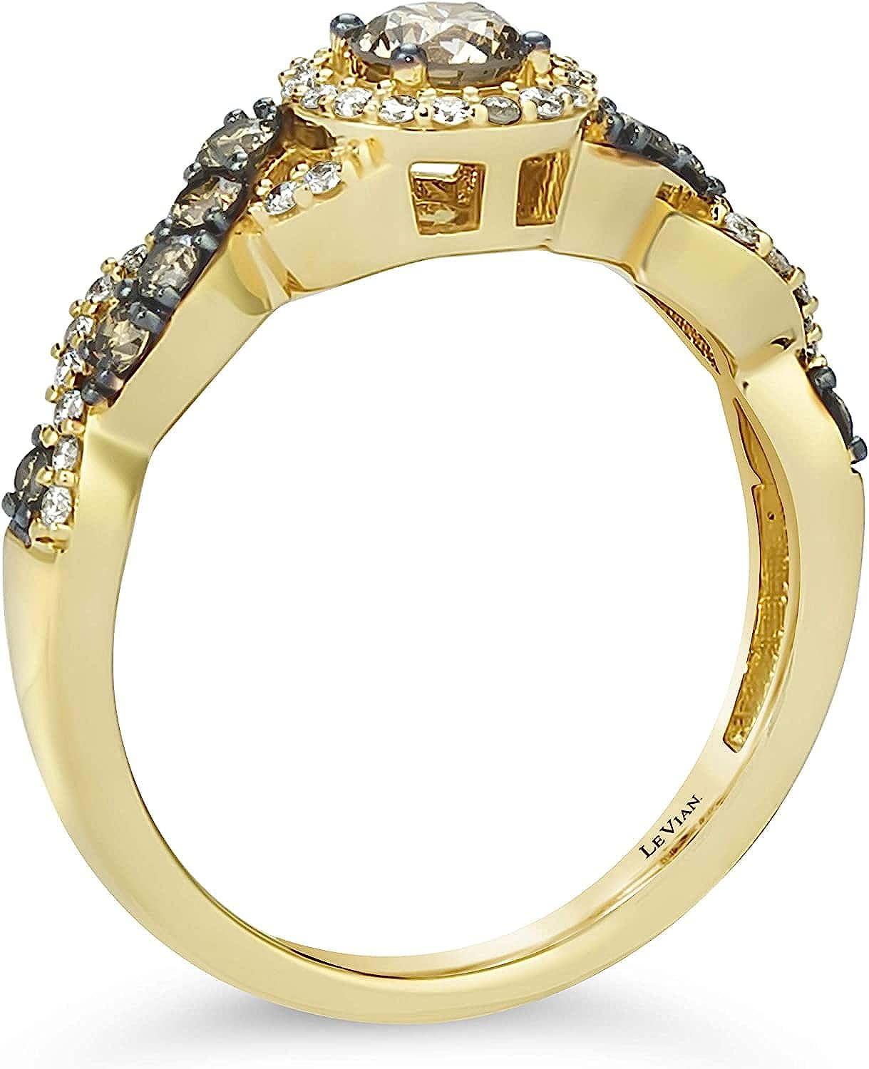 • UNMISTAKABLE ELEGANCE - This glamorous handcrafted 14K yellow gold ring by Le Vian features a large round fancy brown diamond haloed by bright white diamonds. The ring has a crossover split shank with bands of white diamonds and brown diamonds in black rhodium-plated settings that make their color pop by twisting over one another three times. This gorgeous ring is the high-profile statement piece you’ve been looking for. It’s sure to attract compliments at your next soiree or special event