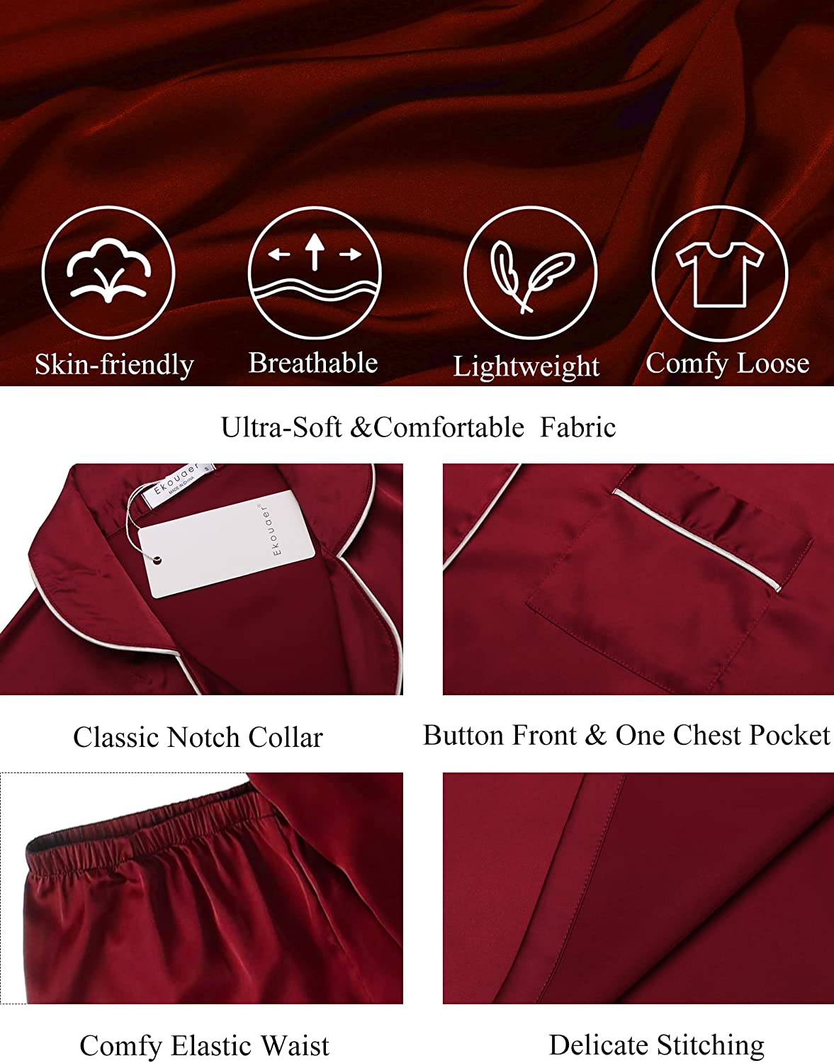 Material:Satin pajama set is made of Premium 96%Polyester+4%Spandex satin fabric.Ultra Soft Silk Ekouaer Sleepwear.The fabric feel of style2 is slightly different
