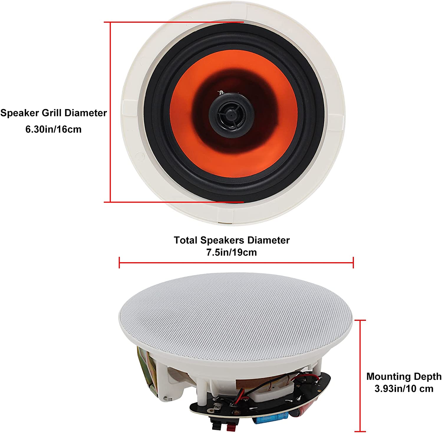 - Mounts on Ceilings: Total Speakers Diameter 6.4 Inches (16.2 CM),Cut Out Diameter 7.5 Inch(19CM), Speakers Depth: 3.93 Inches(10 CM),Mounting Depth:3.93 Inches(10 CM)