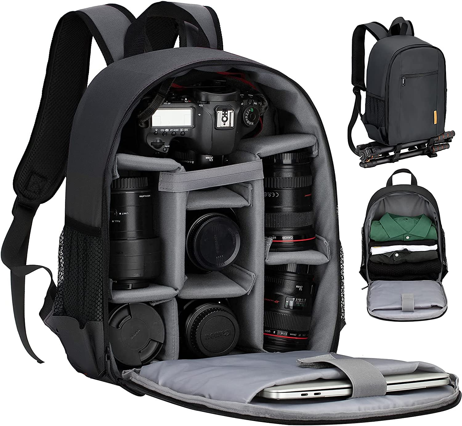 - 【COMPACT DESIGN BUT ENOUGH CAPACITY】 This camera and lens bag provides 7 rooms with 6 pieces padded removable dividers and 1 security strap which can hold 1 camera 6 lenses, while you can DIY the inner space by removing the thick dividers based on your equipment. Inside there is a dedicated sleeve for a 13" laptop or tablet/iPad. Bottom straps for tripod attachment. The front of the camera gear backpack has a zippered pocket for accessories. Mesh pockets on both sides for bottle and umbrella.