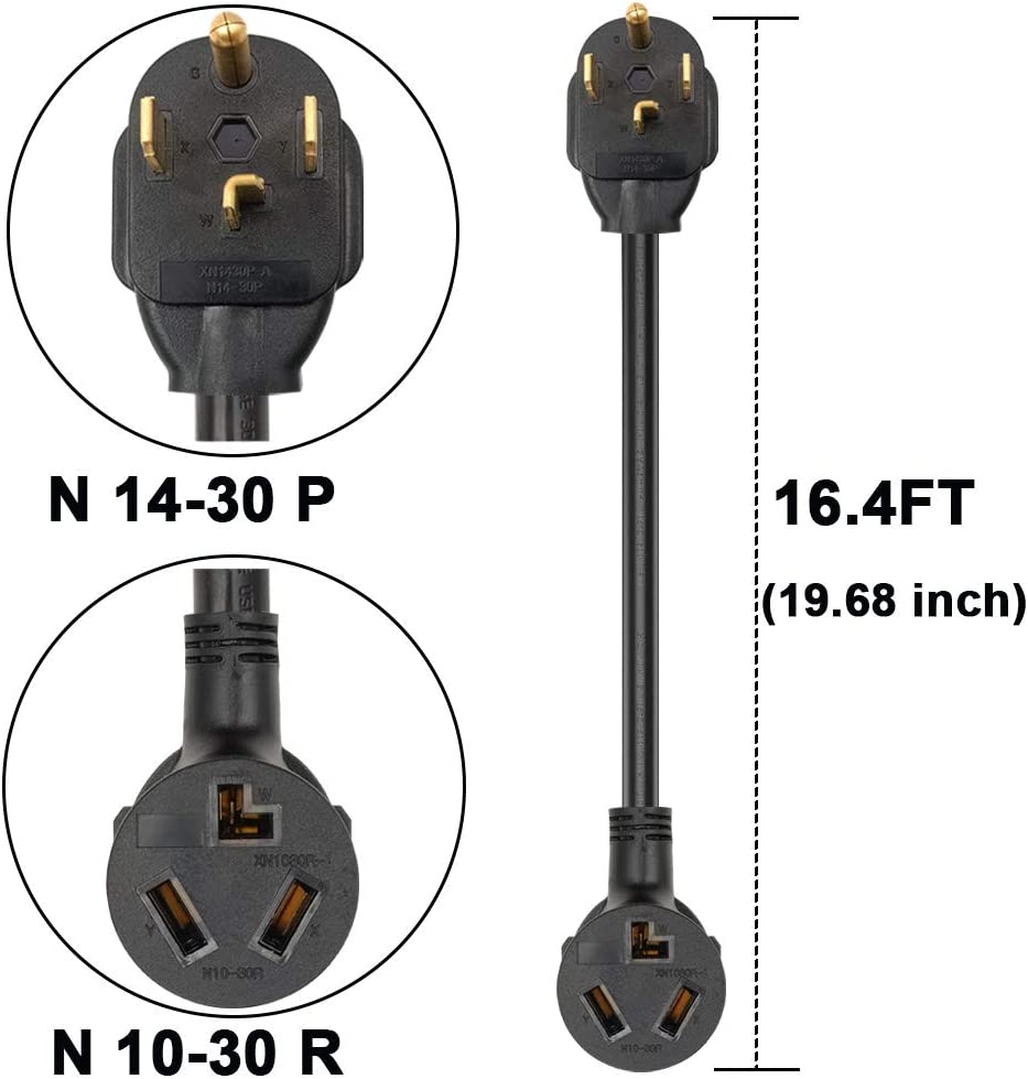 - 【Adapter for 240-Volt Electric Clothes Dryers】Dryer Outlet Ddapter, Dryer adapter cord 14-30 Plug to 10-30 Receptacle, NEMA 14-30P 4-prong male electrical plug is 125/250V, NEMA 10-30R 3-prong female plug connector is 250V. 30 AMP, Max wattage 7500W-Black