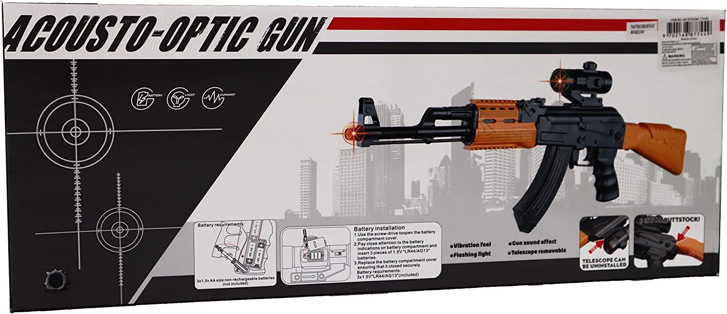 Realistic Looking Toy Riffle with dazzling light and firing sound effect. JOYSAE’s AK-7744B gun toy is the best gift for little boys during the holiday season.
