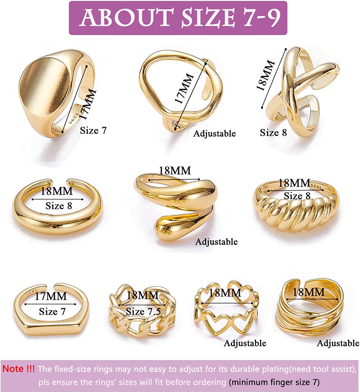 - [Adjustable Gold Thick Ring]---We provide 10 gold chunky ring styles. Their default size is size 7. They can be fine-tuned from size 6 to size 9. The opening can be adjusted to a greater degree for easy wearing.