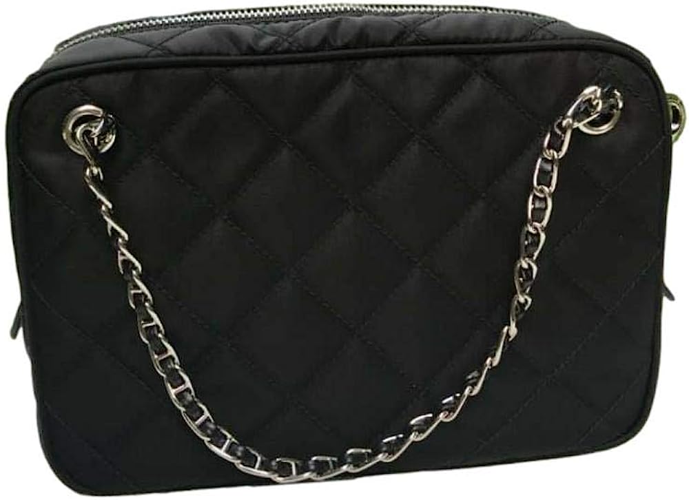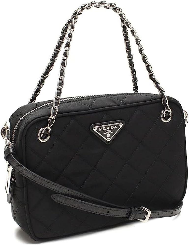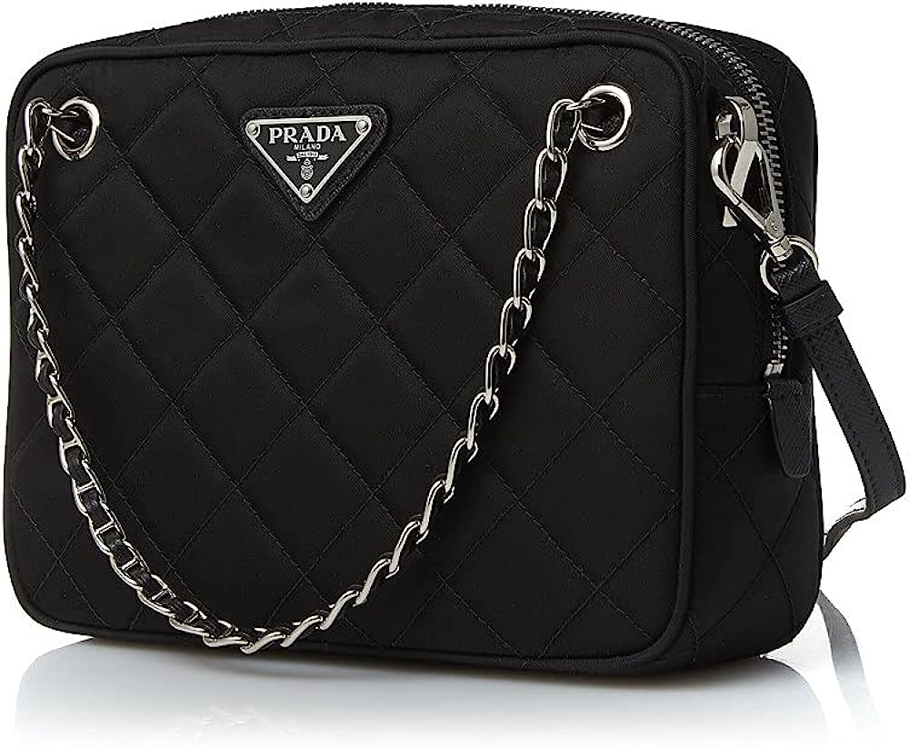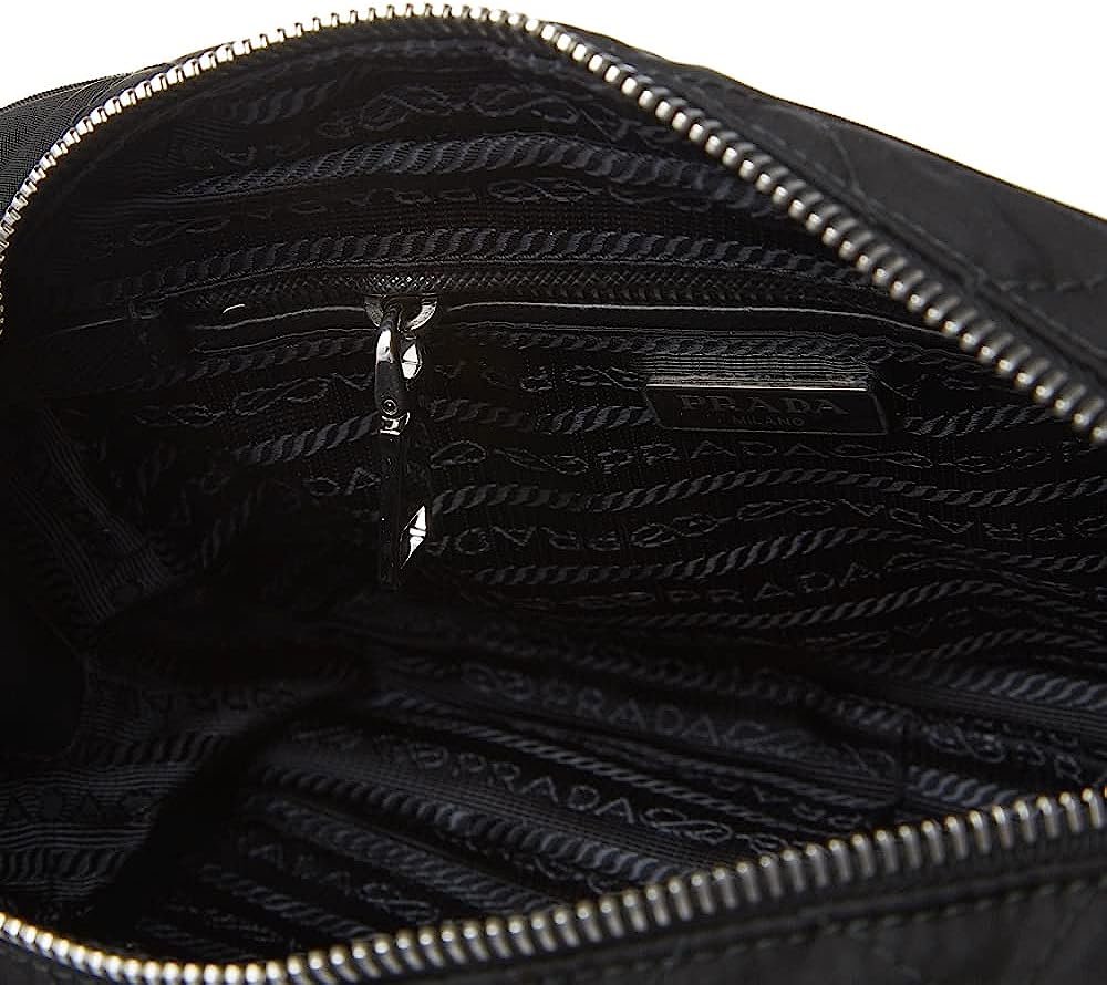 • Color: Black - Nero. Prada Triangle Logo. Quilted Nylon Fabric. Silver-tone Hardware. Interior Black Jacquard Fabric Lining. One Interior Zip Pocket. One Interior Slip Pocket.