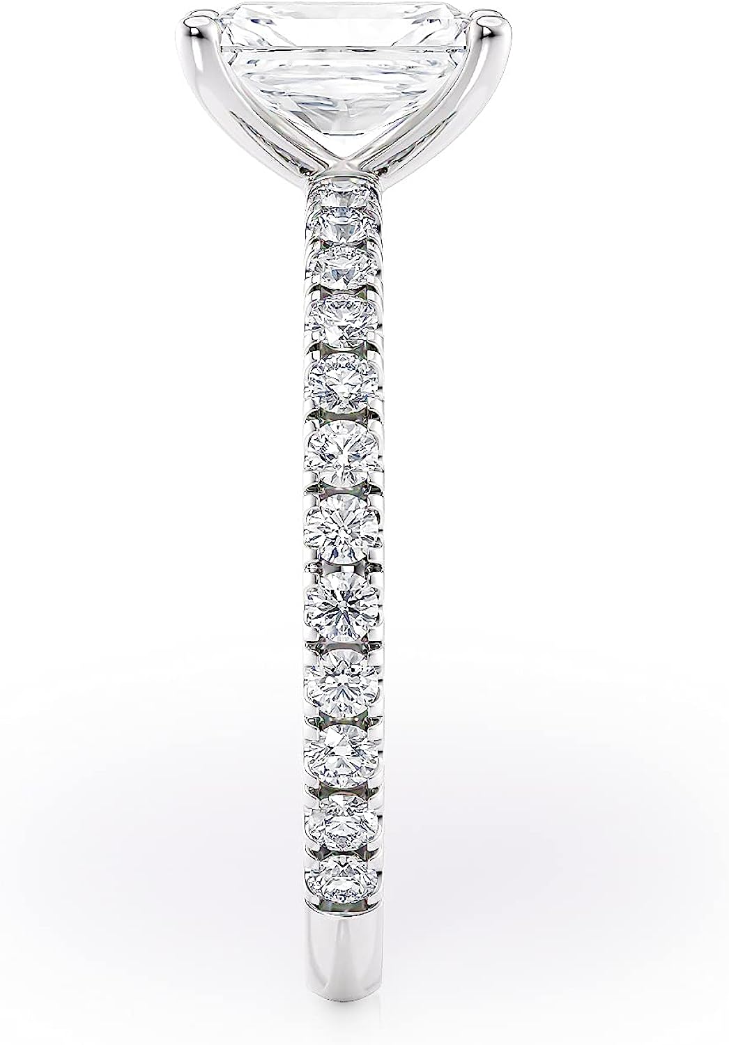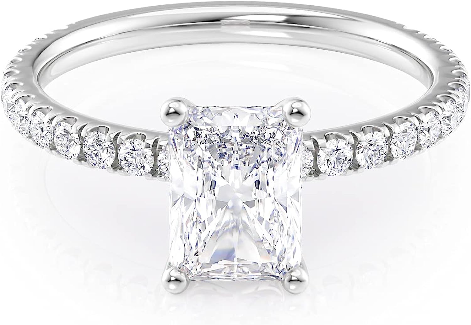 • STUNNING 2 CARAT ENGAGEMENT RING - This luminous 2-carat engagement ring with radiant cut center stone catches the eye with bold sparkle. Diamond Information - Shape : Round, Color : G-H, Clarity : SI, Total Carat Weight : 0.35, Creation: Natural, Treatment: Not treated. Moissanite Information - Shape : Radiant, Color : G-H, Clarity : VS, Gem weight : 1.70 Total Diamond Equivalent Weight (DEW), Creation: Synthetic, Treatment: Not treated. Metal: 14k Rose gold, Setting: Prong, Ring size: 4 to 11