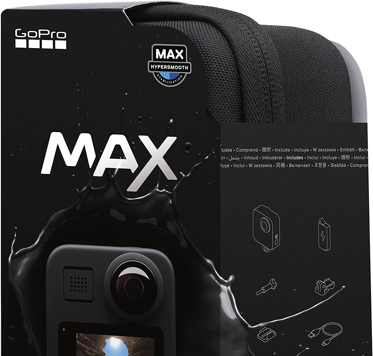 • Includes: GoPro MAX Camera, Rechargeable Battery, Curved Adhesive Mount, 2 Protective Lenses, 2 Lens Caps, Microfiber Bag, Mounting Buckle plus Thumb Screw, USB-C Cable, Carrying Case
