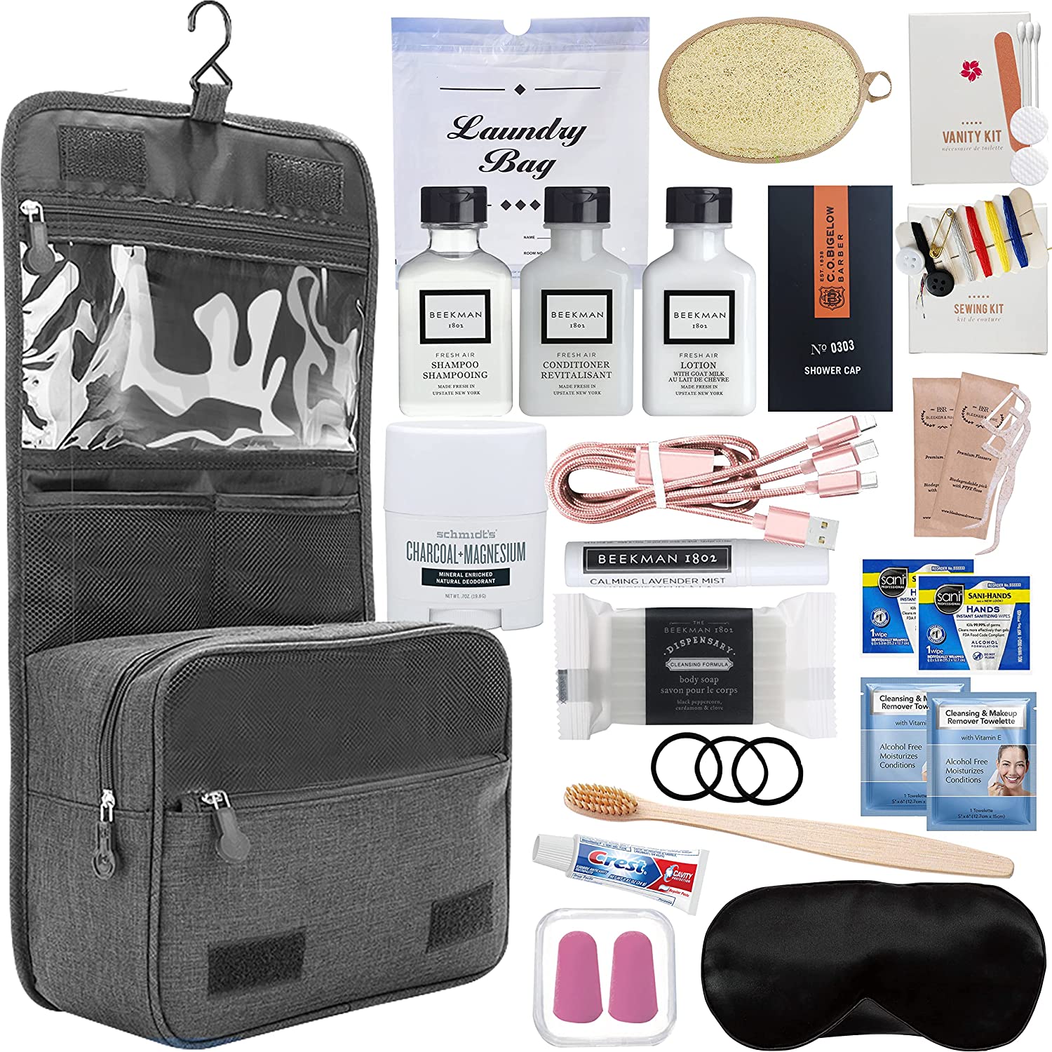 TSA COMPLIANT TRAVEL KIT INCLUDES: Large Capacity Toiletry Bag with Hanger, Extra Long (6.5 ft) Multi Phone Charger, Shampoo and Conditioner, Soap, Sponge, Body Lotion, Deodorant, Sleep Mask, Earplugs, Sanitizing Wipes, Bamboo Toothbrush, Toothpaste, Floss Picks, Makeup Remover Wipes, Laundry Bag, Sewing Kit, Cotton Pads, Q-tips, Nail File. Travel essentials and Travel-Size Toiletries for grooming, hygiene, oral care and comfort for women.