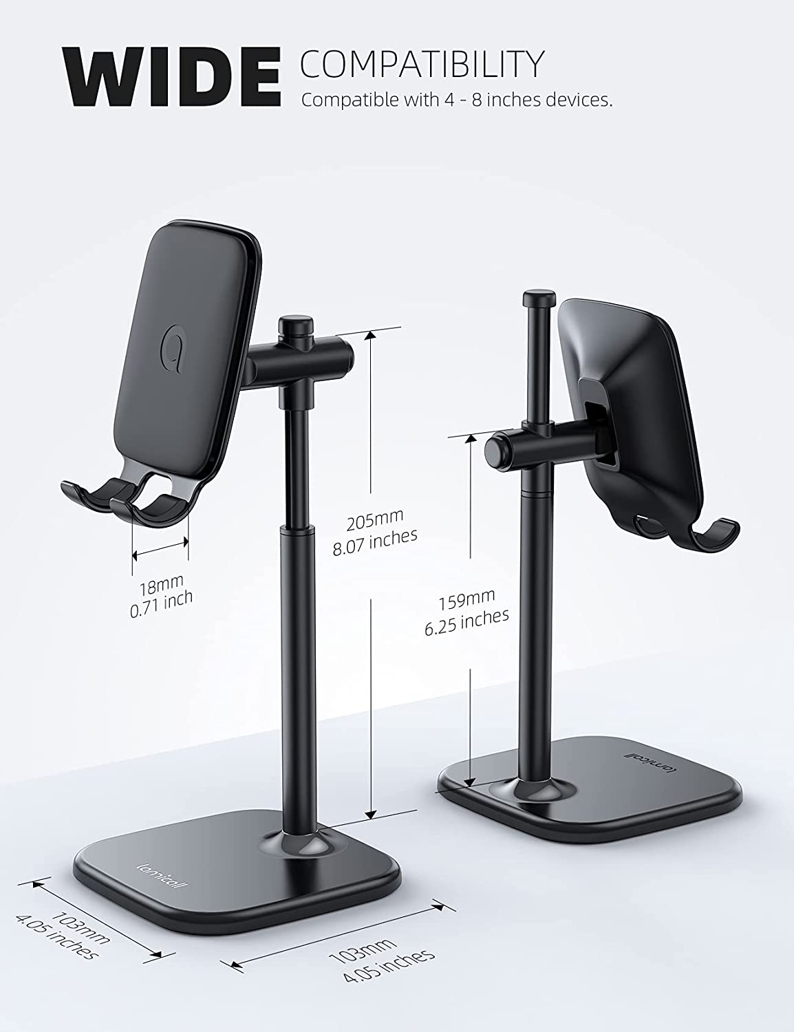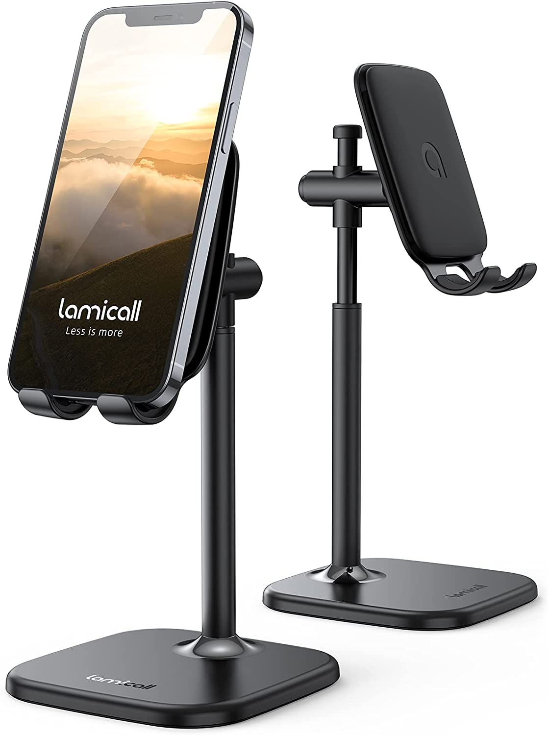 【Height Angle Adjustable】The Upgraded Lamicall phone stand can adjust the height from 159-205mm (6.25-8.07 inches). Easily adjust it to the height as you like by sliding the bar smoothly. 60 degrees angle adjustment provides a comfortable angle as you willing.
